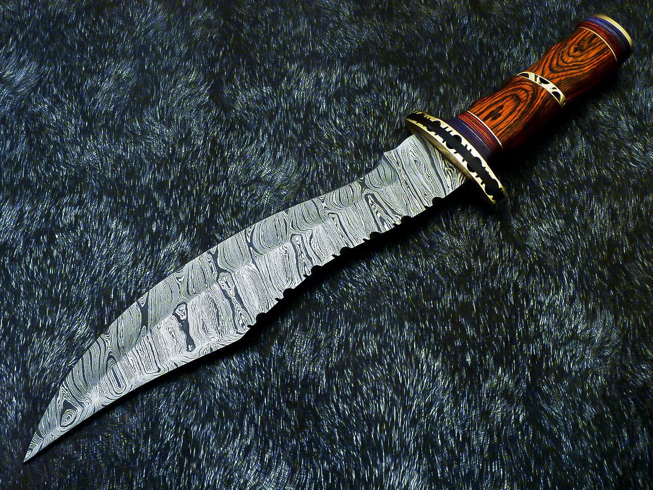 15" Hand-Forged Damascus Bowie Hunting Knife – Hardwood Handle with Brass Bolster