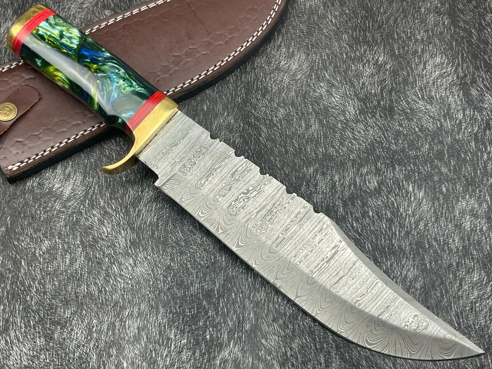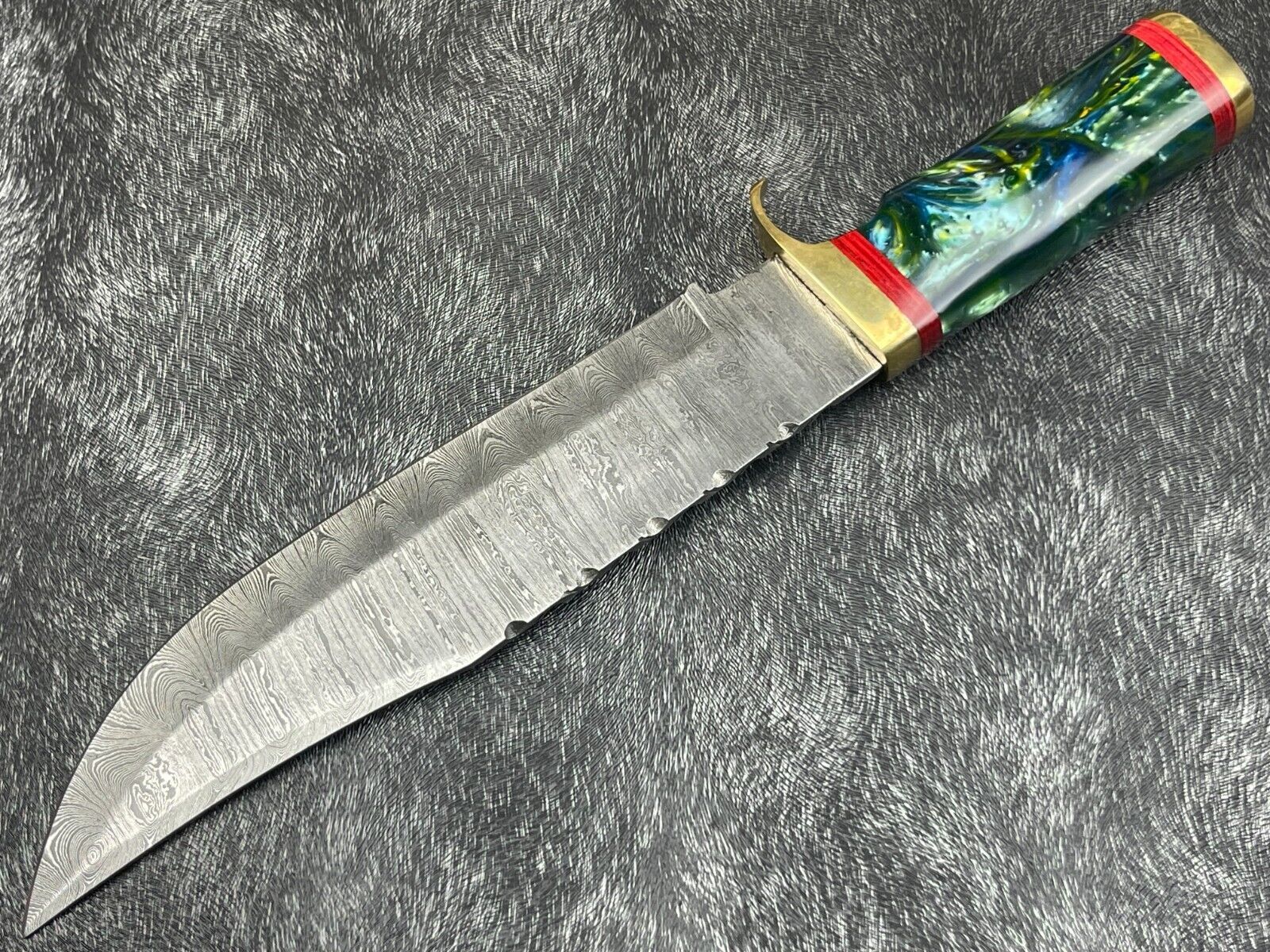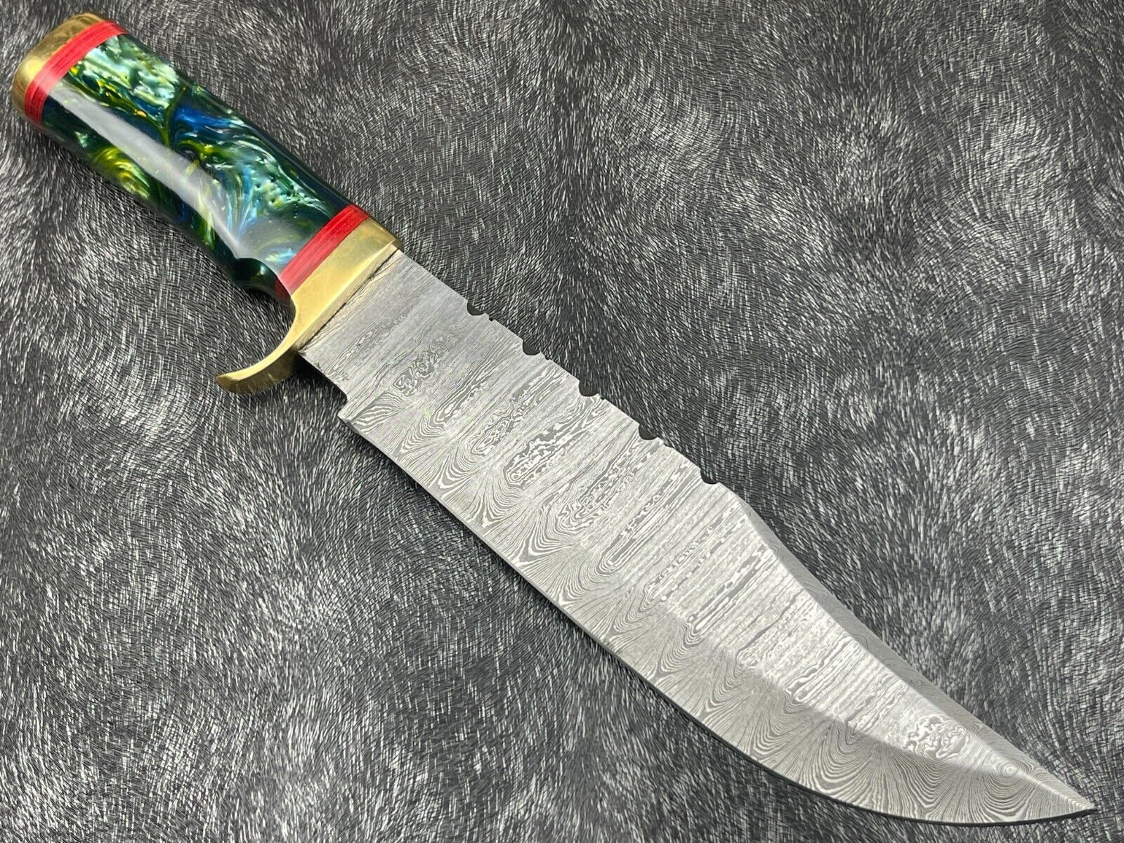 15" Hand Forged Damascus Bowie Knife | Resin Handle & Leather Sheath