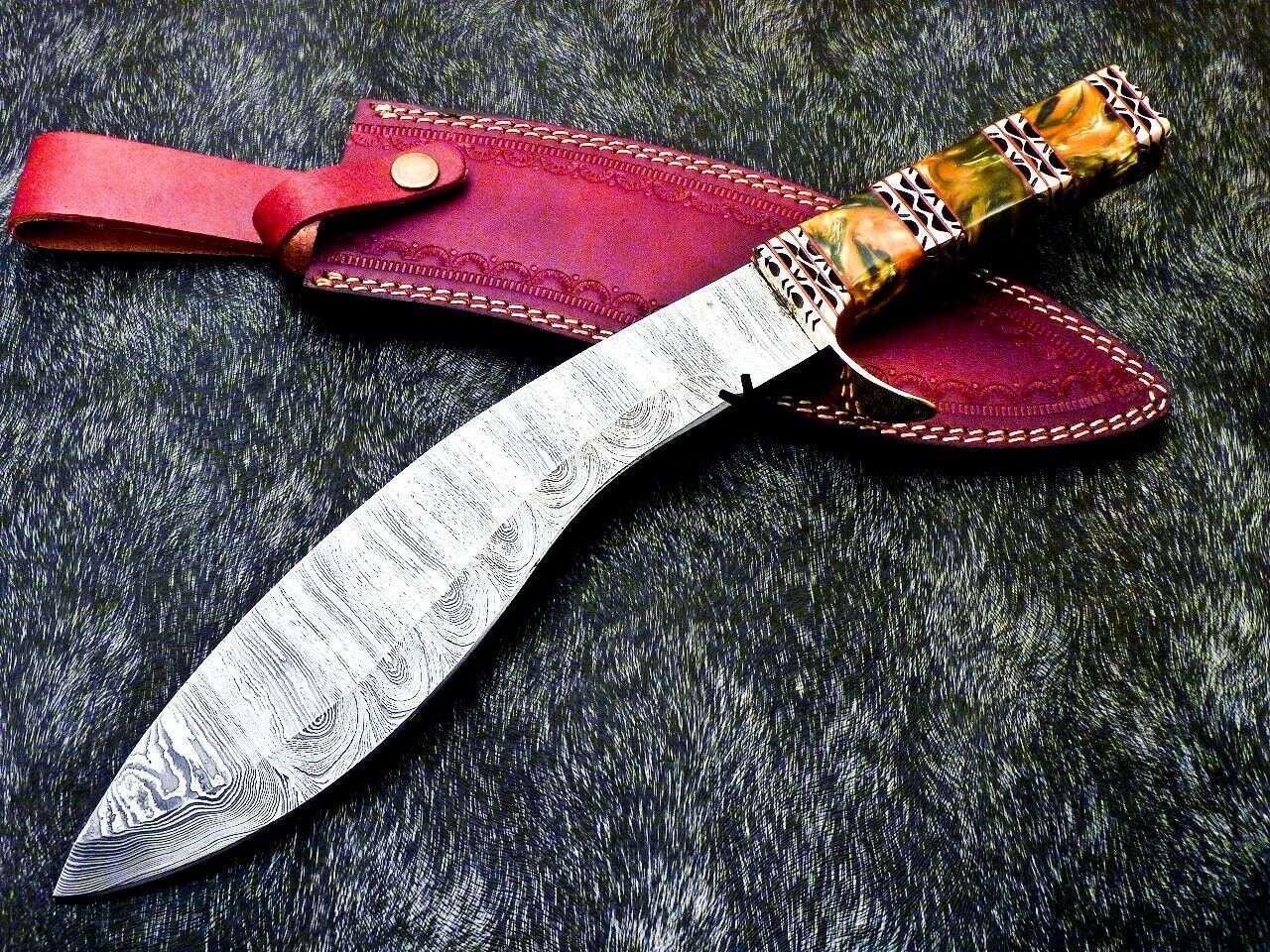 15 Inch Damascus Kukri Knife with Resin Handle and Brass Bolster