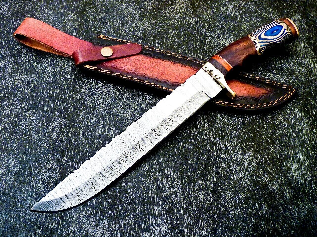 15 Inch Damascus Steel Bowie Knife with Hardwood Handle for Hunting and Camping