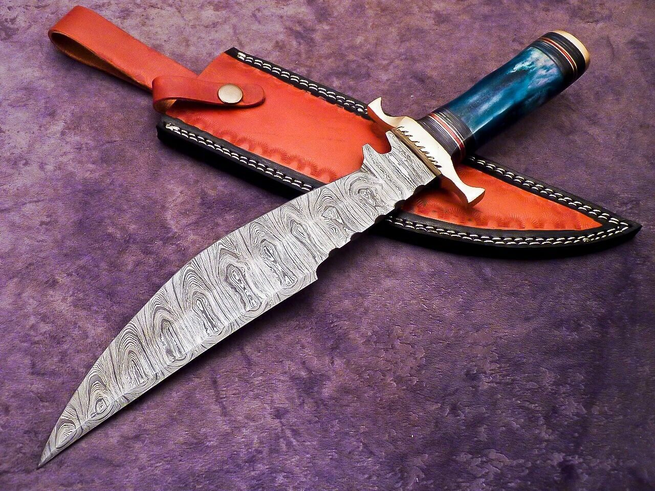 15 Inch Handmade Damascus Steel Bowie Hunting Knife with Epoxy Resin and Brass Handle by Heritage Forge