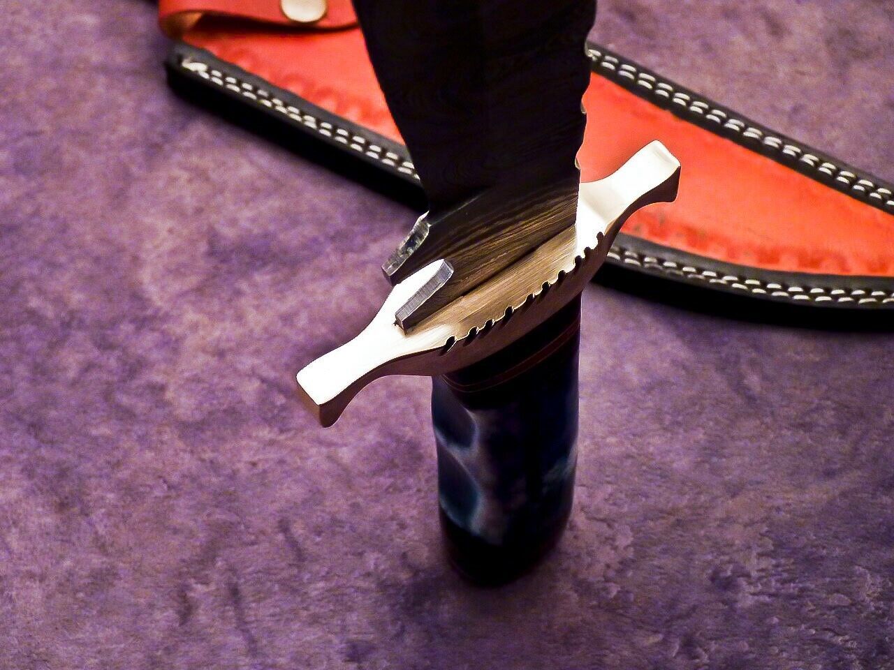 The handle is made of Epoxy Resin and Brass, complemented by a hand-cast brass bolster for superior balance and grip. The spine features custom file work, adding a distinctive touch to this versatile camping and hunting knife. With a solid 4 mm thick blade, this full tang knife is designed to handle the toughest outdoor conditions while offering timeless aesthetic appeal.