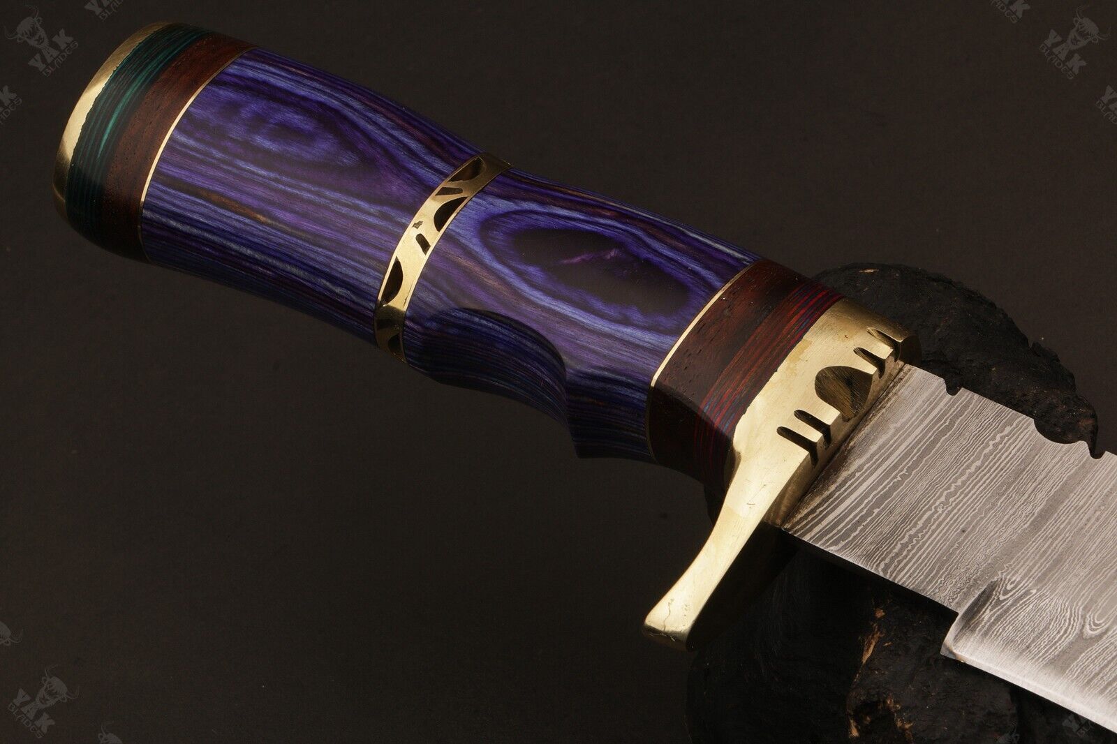 The handle is a blend of natural wood, accented with brass spacers and a handmade Damascus bolster, giving this knife both balance and durability. With a full tang and 4 mm thick spine, this blade is built to handle demanding tasks in the wild.