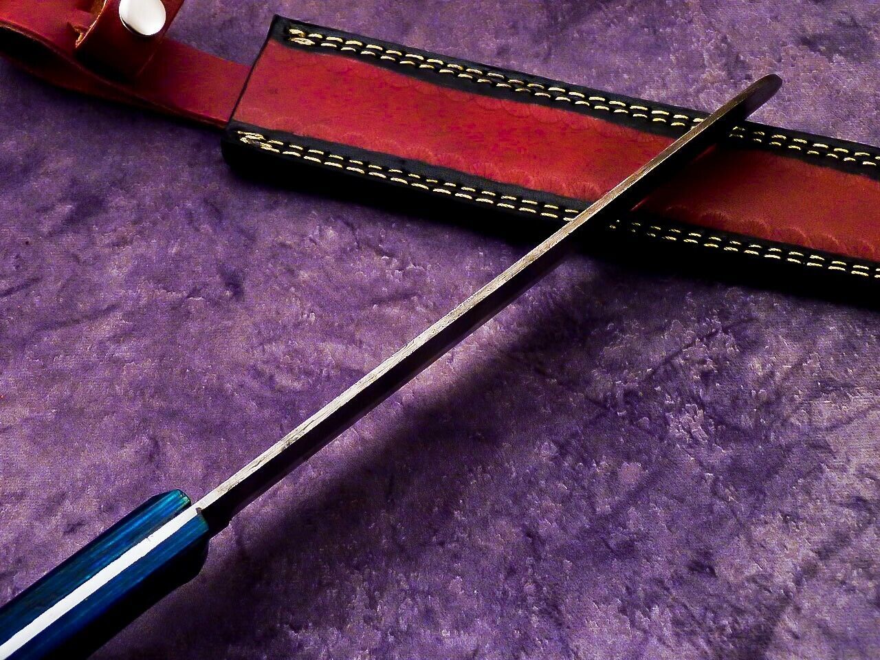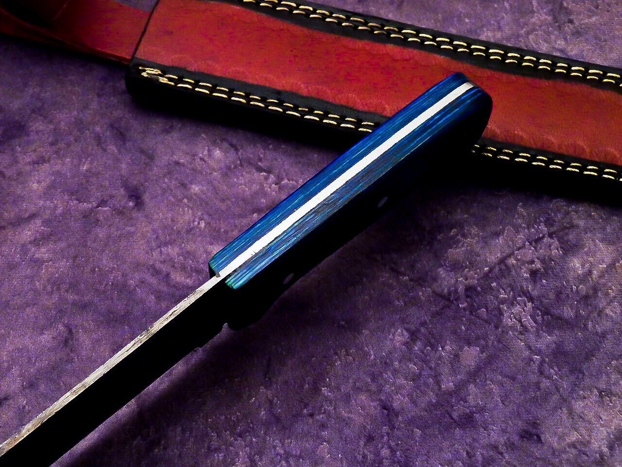 The 5-inch handle, crafted from premium hardwood with brass pins, ensures a secure, ergonomic grip, offering comfort and control during extended use. With a 4mm thick blade, hand-ground on both sides and a false edge left on the spine, this knife balances strength with cutting efficiency. Every piece is 100% handmade, ensuring that no two knives are alike, making this a functional work of art. For protection and safe storage, the knife comes with a high-quality leather sheath.