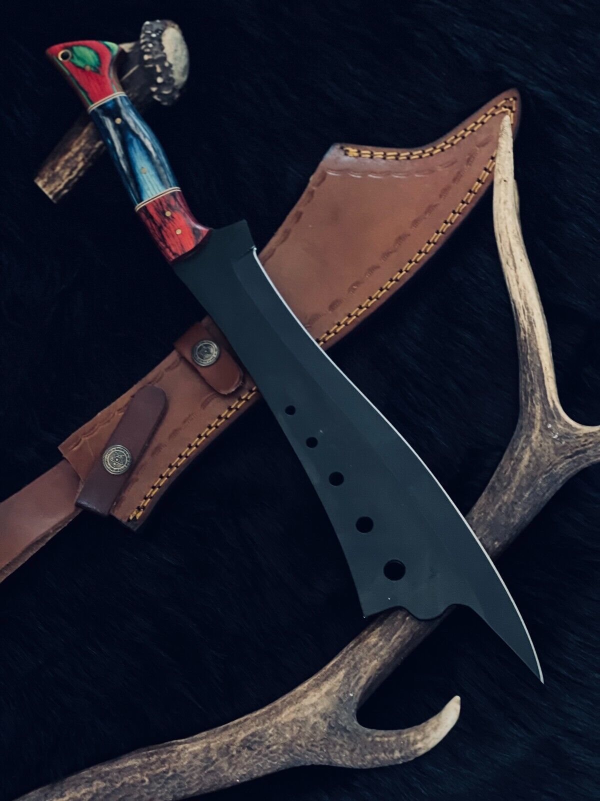 This machete knife is both fully functional and visually striking, showcasing craftsmanship that combines practicality with aesthetic appeal. Whether used for heavy-duty camping, hunting, or survival scenarios, the Heritage Forge 16.5" D2 Steel Machete Knife is a reliable tool and an impressive collector’s piece. Complete with a leather sheath, it ensures safe storage and easy portability.