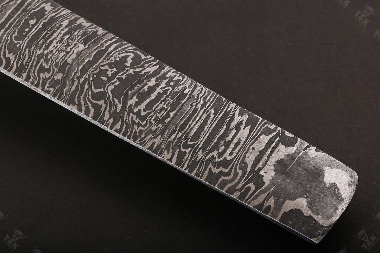 This 16-inch custom handmade Fire Damascus Steel Brisket Knife is a true masterpiece designed for professional chefs and cooking enthusiasts. Hand forged with precision, the blade measures 11 inches with a robust 4 mm thickness, ensuring exceptional strength and durability. The handle, made of stained camel bone and natural wood with brass spacers, features a handmade Damascus steel bolster for superior balance and comfort during use. Each knife is fully functional and unique, with the Damascus blade resulting from hours of meticulous forging, producing layers upon layers that create a saw-blade effect at a microscopic level, allowing the edge to remain sharp longer than conventional knives. Perfect for slicing brisket, meat, and other culinary tasks, this knife combines beauty, functionality, and craftsmanship. Every piece is individually crafted, making it a valuable addition to any kitchen or knife collection.