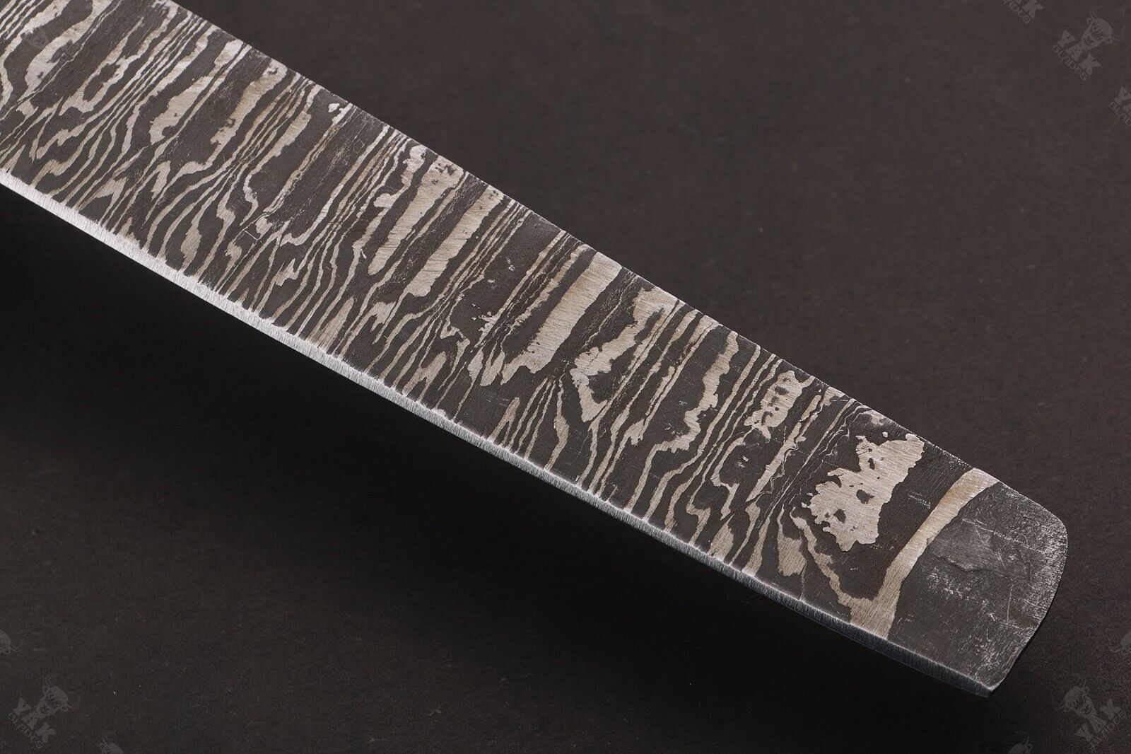 This 16-inch custom hand forged Fire Damascus Steel Brisket Knife is designed for chefs and culinary enthusiasts who appreciate superior craftsmanship. The blade measures 11 inches with a 4 mm thickness, providing exceptional strength and durability for slicing brisket, meat, and other kitchen tasks. The handle is made of stained camel bone and natural wood with brass spacers, featuring a handmade Damascus steel bolster for perfect balance and comfort. Each knife is fully functional, 100% handmade, and uniquely patterned, with the Damascus layers created from hours of careful forging. This intricate layering produces a microscopic saw-blade effect that keeps the edge sharp longer than ordinary knives. Combining elegance, performance, and uniqueness, this knife is ideal for professional kitchens, collectors, or as a special gift.