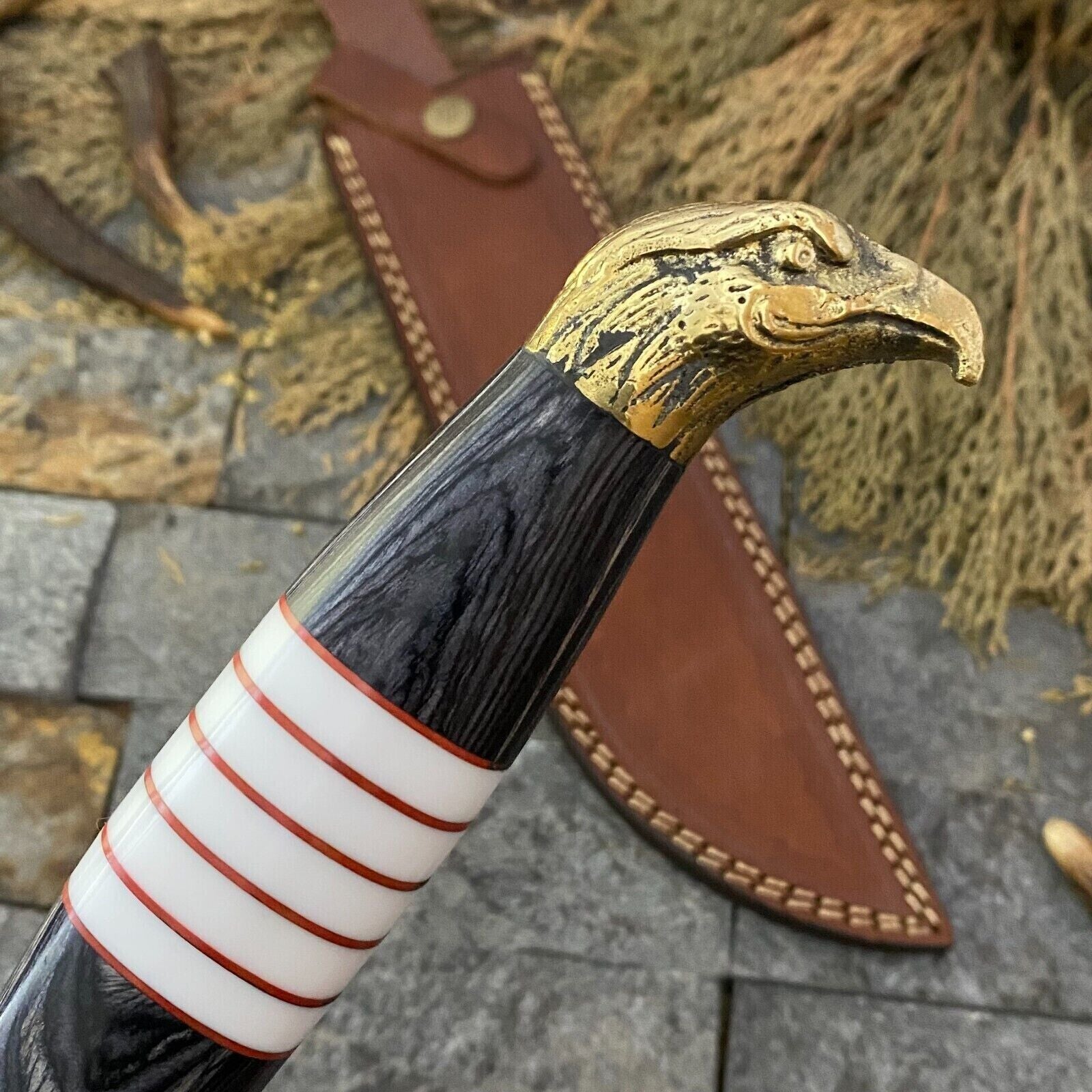 Experience the ultimate in outdoor precision with the Heritage Forge 16" Custom Handmade Damascus Steel Big Bowie Hunting Knife. Crafted from modern pattern-welded Damascus steel, this knife boasts 512 layers of high carbon and soft steel, expertly twisted, forged, and etched to reveal a bold, intricate pattern that extends from tip to tang. Its full tang construction ensures unmatched strength and durability, making it perfect for hunting, camping, and survival tasks. The 10-inch clip-point blade is heat-treated for maximum toughness and sharpened to perfection, providing razor-sharp cutting performance for heavy-duty use. The handle combines solid wood and brass guard accents, offering a secure and ergonomic grip while highlighting the knife’s handcrafted artistry. Every Heritage Forge knife is 100% handmade, ensuring each piece is unique and meticulously finished. Included is a premium leather sheath, custom-fitted to this knife for safe carry and storage. Built to withstand rigorous use, this hand-forged Damascus Bowie knife delivers both functionality and collector-worthy aesthetics. Whether for outdoor adventures or display, this knife represents exceptional craftsmanship and heritage-quality construction.