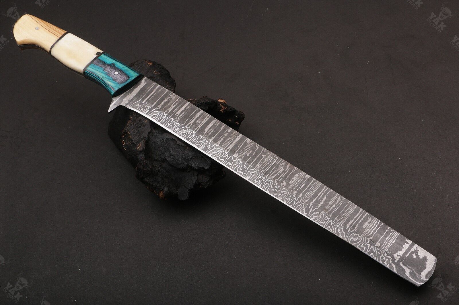 This 16-inch custom hand forged Fire Damascus Steel Brisket Knife is a masterpiece designed for both kitchen and outdoor use. Crafted with a 4 mm thick Damascus steel blade, it features 512 true layers of 1095 and 15N20 high carbon steel, creating a stunning pattern that flows all the way to the edge. The blade exhibits exceptional strength, sharpness, and a saw-blade effect at a microscopic level, allowing it to maintain its cutting edge longer than conventional knives. The handle is made from stained camel bone and natural wood with brass spacers, complemented by a handmade Damascus steel bolster, offering a secure and comfortable grip. Fully handmade and robustly constructed, this knife is not only visually striking but also functional for chopping, slicing, and carving. Ideal as a unique gift, it is perfect for chefs, hunters, campers, and knife enthusiasts. Each knife is carefully forged to ensure durability, precision, and a lifetime of use.