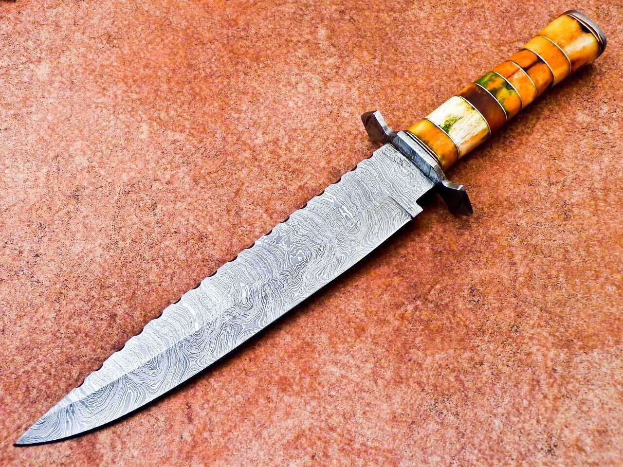 16" Handmade Damascus Steel Camping Bowie Knife – Stained Camel Bone Handle