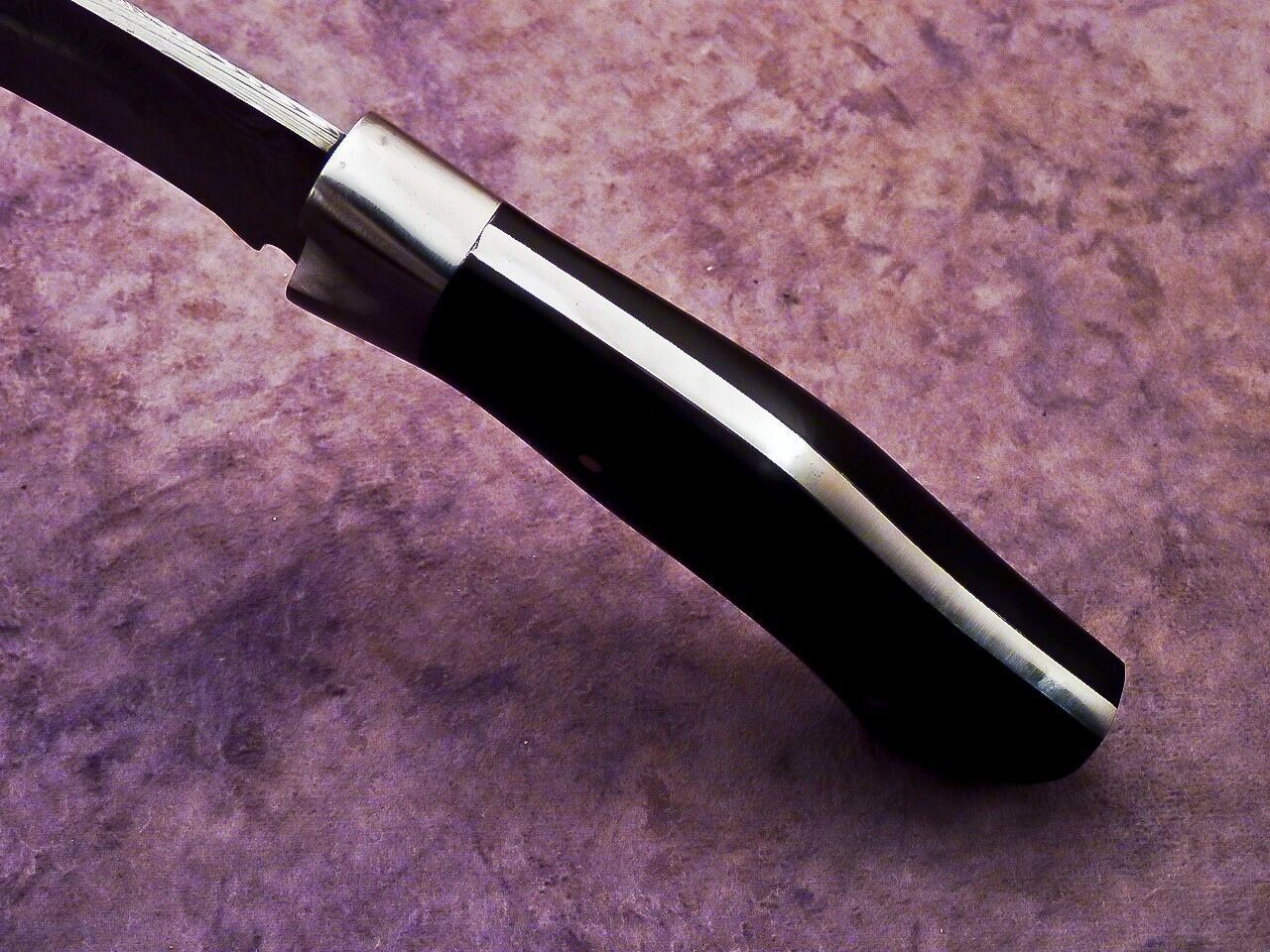 The handle is crafted from bull horn, providing an ergonomic and secure grip for precision and control in the field. Full tang construction ensures balance, stability, and long-lasting durability, making the knife a reliable companion for hunting and survival scenarios.