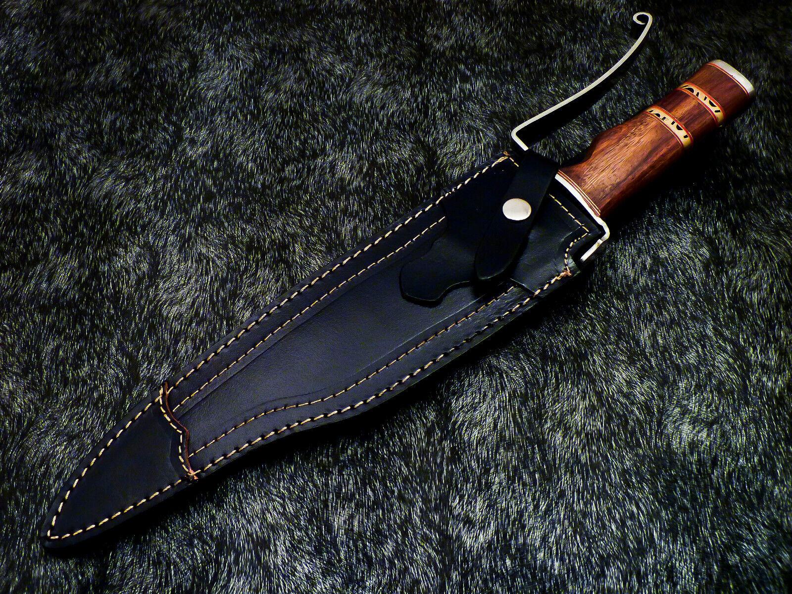 With an overall length of 17 inches, this knife is built for serious hunters, collectors, and outdoor enthusiasts. The 5-inch handle is crafted from polished natural wood, designed for comfort, balance, and an elegant finish. A handmade Damascus steel bolster adds extra strength and style to the knife’s construction. Ideal for wilderness survival, hunting, or showcasing as a collector’s piece.