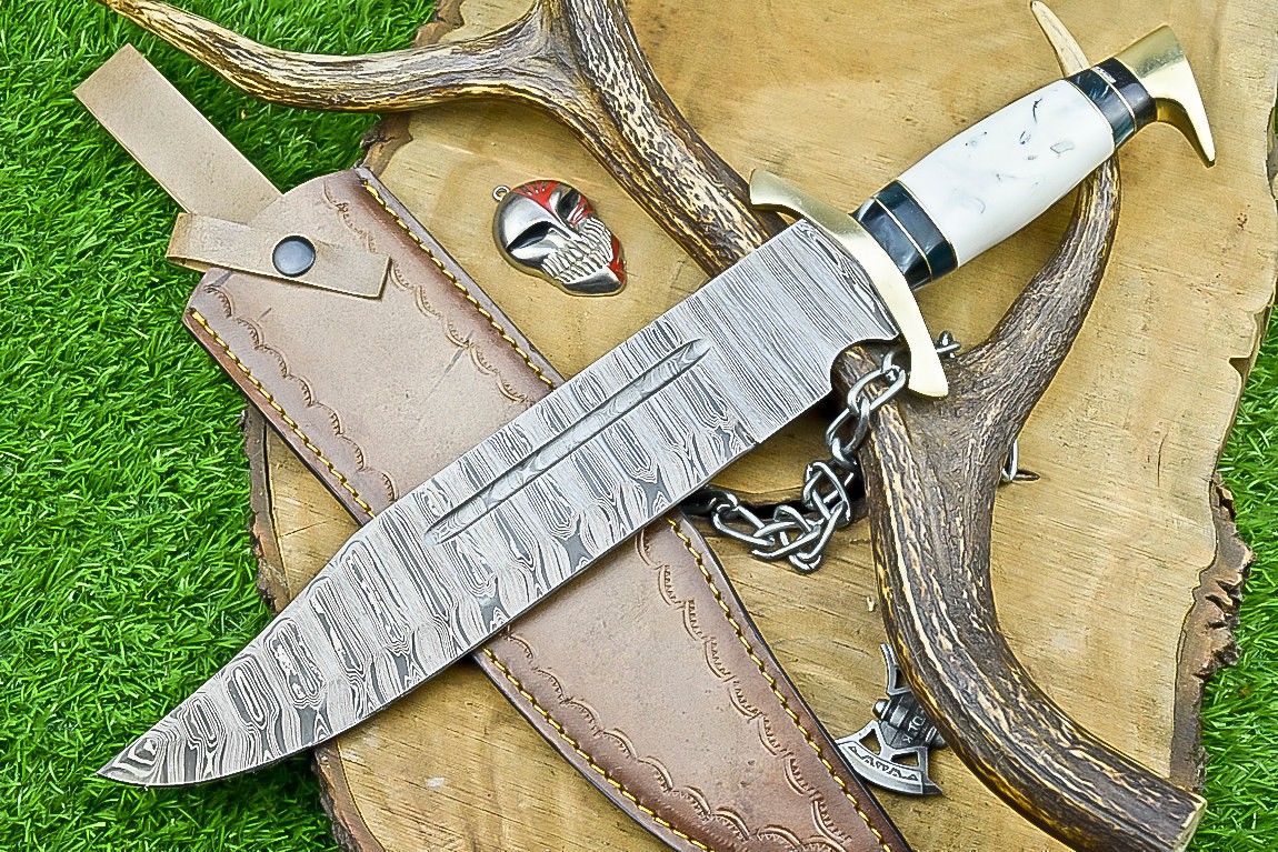 This 17 inch handmade Damascus steel Bowie knife is a true masterpiece for outdoor adventurers and collectors alike. Expertly forged with high carbon Damascus steel, the blade features over 500 layers of steel, offering superior strength, edge retention, and resilience. Its 4 mm thick blade is heat-treated to a Rockwell hardness of 58–60 HRC, ensuring it can tackle heavy-duty tasks in rugged environments.