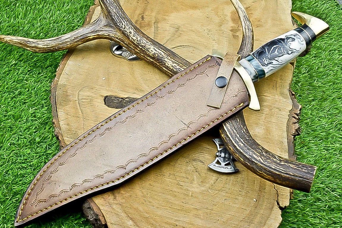 The handle is made from premium resin and accented with a hand-crafted brass bolster, providing a secure grip and an elegant finish. This custom hunting knife is not just functional—it’s a work of art, featuring a unique Damascus pattern created through meticulous forging.