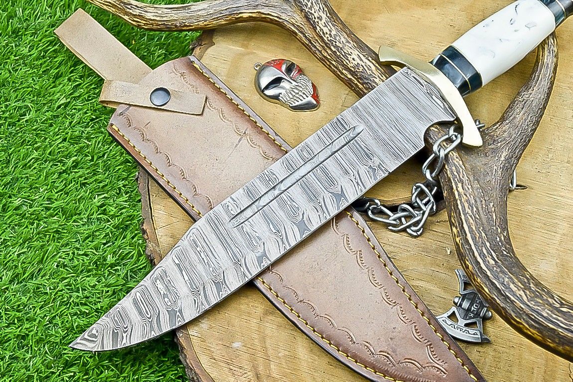 17" Premium Handmade Damascus Steel Bowie Knife – Outdoor Hunting Knife with Leather Sheath