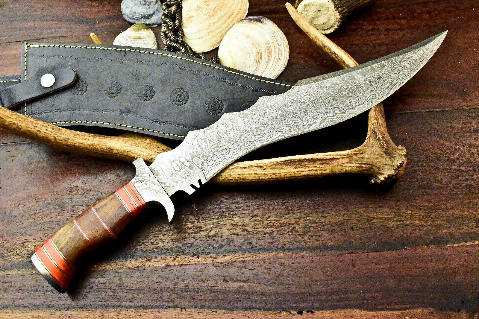 18" Damascus Bowie Hunting Knife – Walnut Wood Handle with Leather Sheath