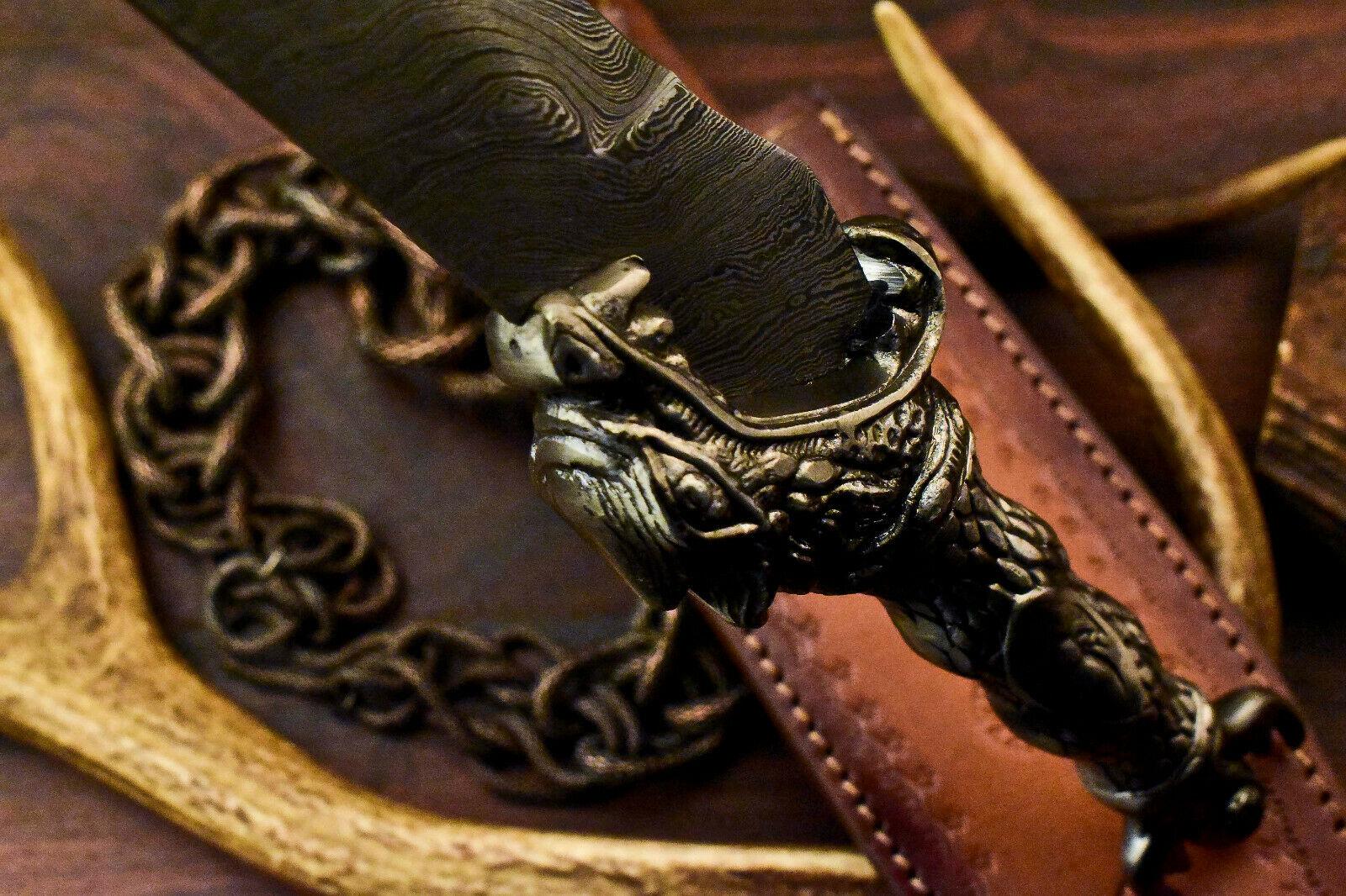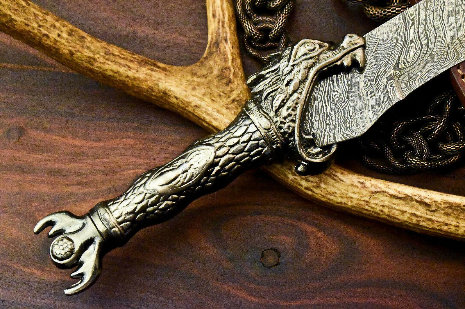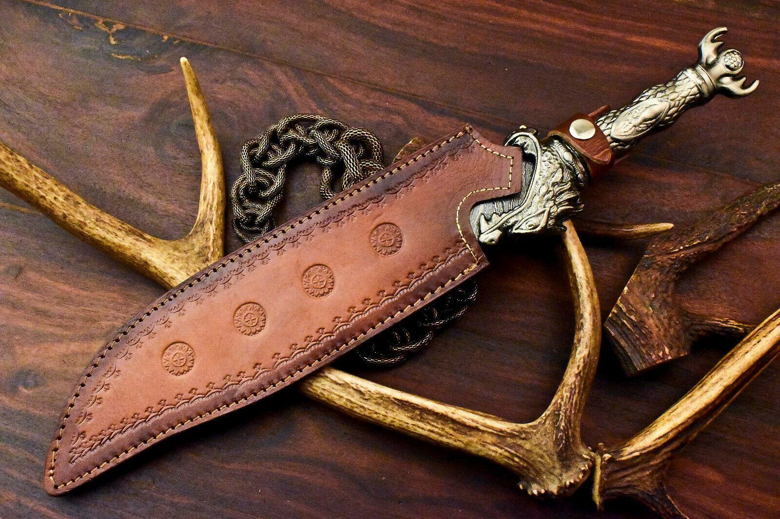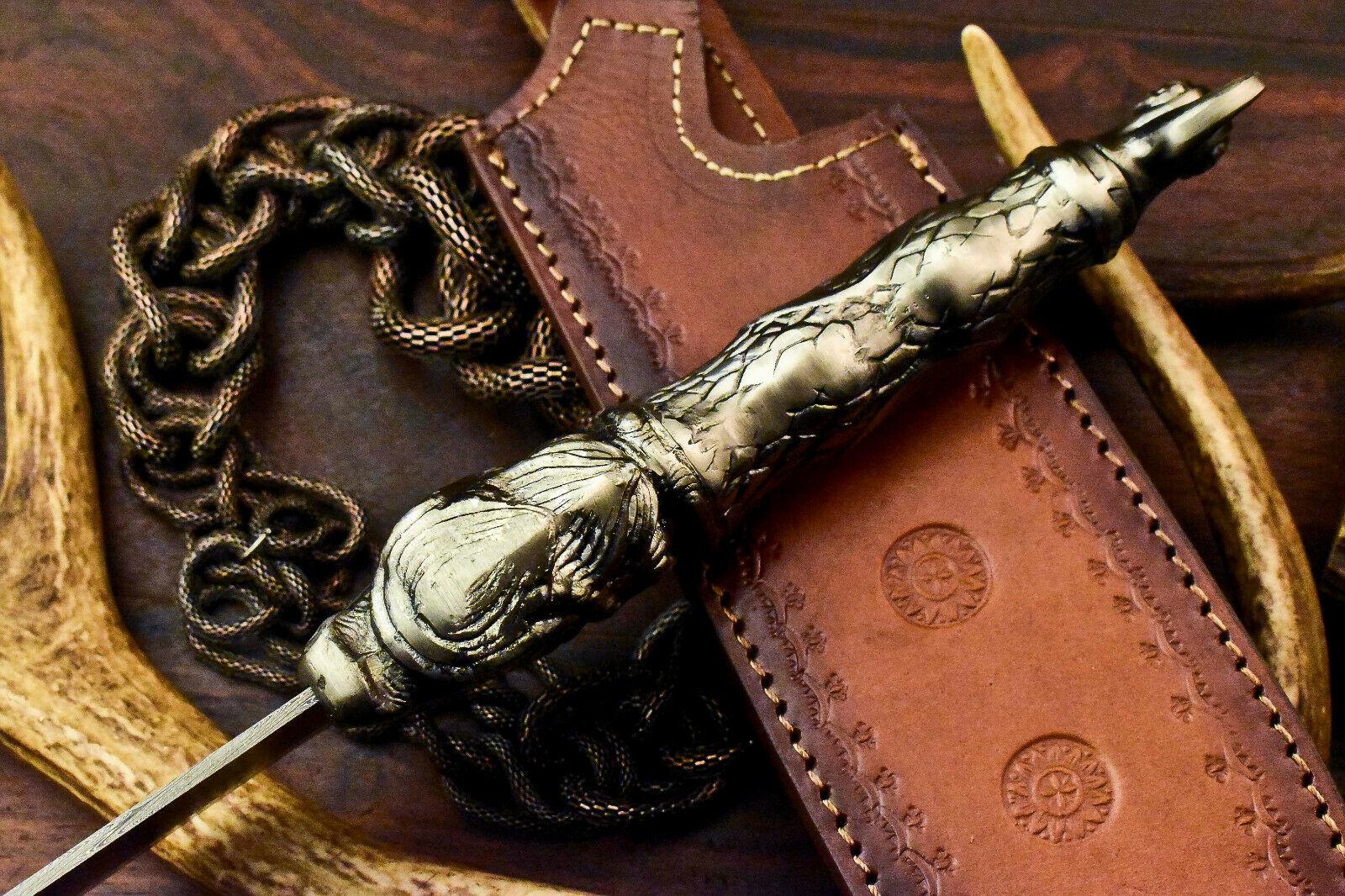 This heavy-duty knife is oil tempered to 58–60 HRC, ensuring long-lasting edge retention and cutting precision. The polished pewter-finished handle offers a regal touch, ergonomically shaped for a solid, confident grip. The knife is sharpened to a 20-degree edge, perfect for tactical use, bushcraft, or serious hunting applications.