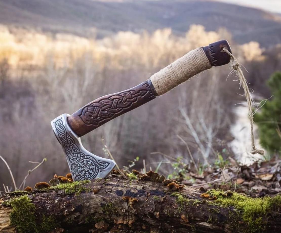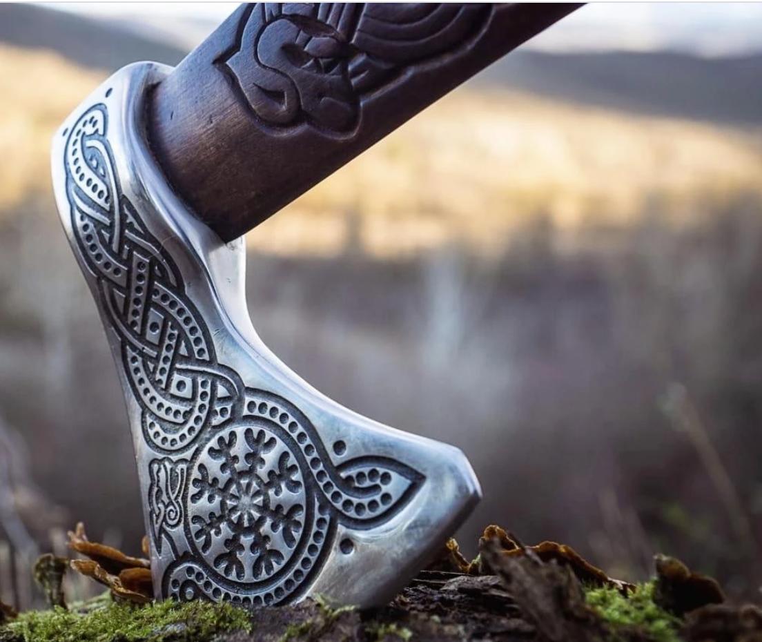 This 18-inch Dragon Engraved Hatchet is a masterfully hand-forged Viking axe crafted from high-carbon steel, designed for collectors, outdoor enthusiasts, and enthusiasts of Norse history. The axe features a meticulously engraved dragon design, along with custom etching and carving for a truly unique appearance. The handle is made from ash wood with rosewood accents and is wrapped in leather, providing both durability and a comfortable grip. Treated with oil for longevity, the shaft ensures stability and balance during use. With a cutting edge of 5.5 inches and a total length of 18 inches, this axe is perfectly sized for throwing, camping, or display. Each piece is handcrafted individually, so slight variations in wood grain and etching are natural, making your axe a one-of-a-kind treasure. This Viking axe also makes an exceptional gift for weddings, anniversaries, birthdays, Father’s Day, Mother’s Day, or for anyone who appreciates functional art and historical weaponry.