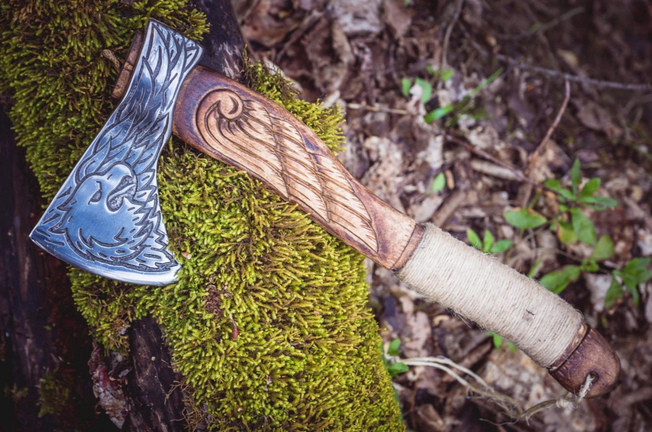 This 18-inch Eagle Engraved Viking Hatchet is a masterfully hand-forged tool crafted from high-quality carbon steel. Each axe is individually handmade, featuring custom engraving, etching, and carving to create a unique design. The blade is razor-sharp and fully functional, perfect for throwing, bushcraft, or as a stunning collectible.
