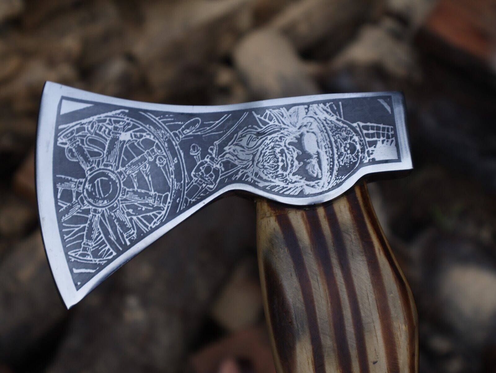 This 18-inch handmade Viking axe is forged from high carbon steel, combining strength, tradition, and precision in one powerful tool. With an overall length of approximately 18 inches, a 6.5-inch blade width, and a 3.5-inch sharp cutting edge, it is perfectly designed for chopping, hunting, camping, or display. The 16-inch ash wood handle is carefully hand engraved, offering both durability and a secure, comfortable grip. The blade is expertly heat treated to a hardness of 56–57 HRC, ensuring excellent performance and long-lasting sharpness. Each axe head is hand forged with layered carbon tool steel and finished with meticulous craftsmanship to create a striking and functional piece. This Viking tomahawk comes complete with a premium thick leather sheath, hand-stitched for strength and safety, making it easy to carry and store. Whether you are a collector of Viking weapons, an outdoorsman in need of a reliable hatchet, or searching for a unique gift, this custom handmade axe blends authentic Nordic-inspired artistry with modern durability, making it a standout piece for use or display.