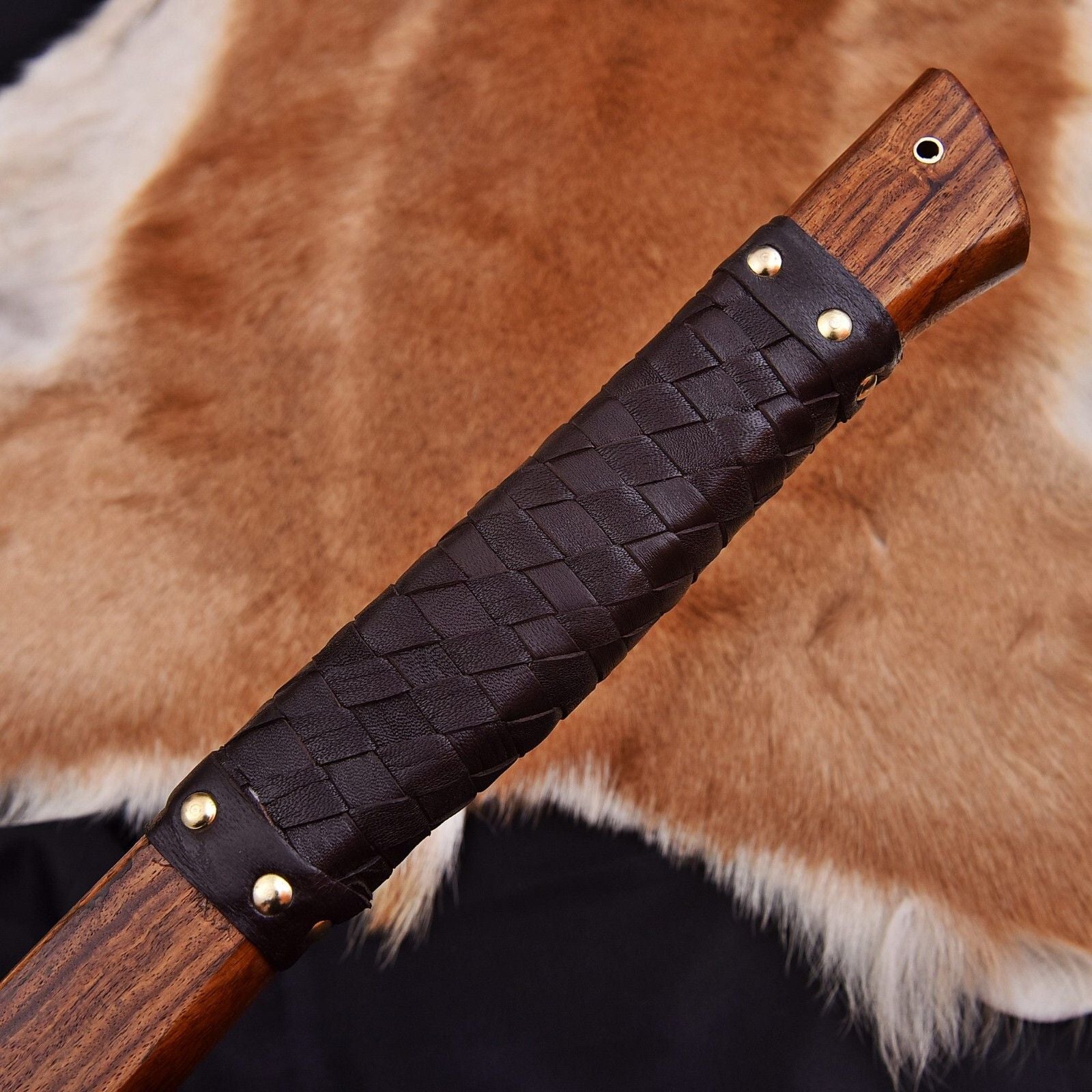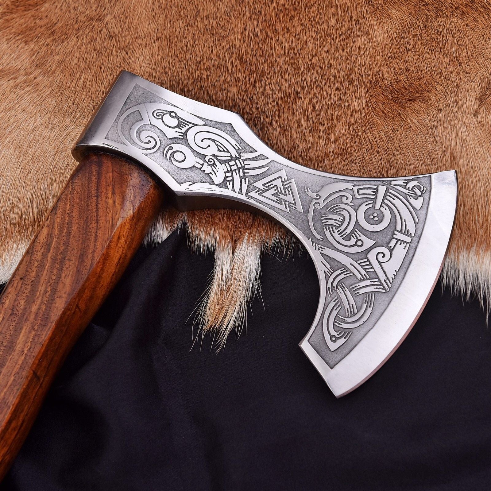 This hand forged Viking combat axe is built with durability, balance, and authentic design in mind. Measuring 19.5 inches overall, it features a finely crafted exotic wood handle that provides both comfort and strength during use. The axe head is forged from 1095 high carbon steel, with a cutting edge of approximately 4.5 inches and a head length of 7 inches. With a Rockwell hardness of 54 at the edge and 42–45 along the spine, this Viking tomahawk axe is tough, sharp, and reliable. The 4 mm thick blade is expertly ground on both sides, with a false edge left on the top for added character. Heat-treated for superior durability, the blade holds an edge well while withstanding heavy use. This axe comes with a premium leather sheath for safe storage and transport. Perfect as a replica Viking axe, it is suitable for collectors, reenactors, and outdoor adventurers who appreciate the strength and artistry of Viking battle axes. Whether displayed or used as a functional tool, this piece captures the bold spirit of Norse craftsmanship and makes a powerful addition to any collection.