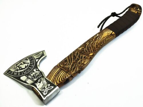 This hand forged Viking throwing axe is a true representation of ancient craftsmanship and modern durability. Measuring 19 inches in length with a 6.5-inch cutting edge, this axe is crafted from high carbon steel, delivering exceptional strength and sharpness. The blade features detailed engraving and etching, giving it a striking, historically inspired appearance while remaining fully functional for practical use.