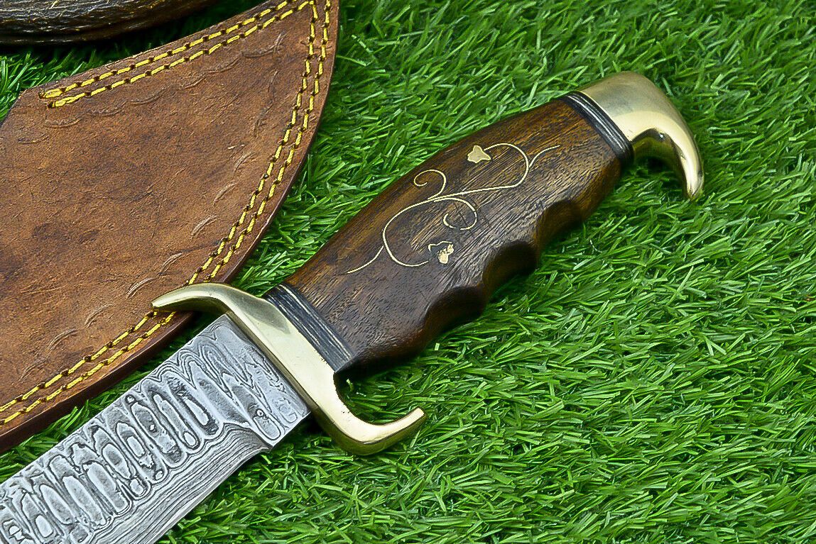 The elegant, curved 14-inch blade is paired with a natural wood handle, accented by a hand-casted brass bolster, offering a comfortable, secure grip for heavy-duty cutting tasks. Whether you're camping, hunting, or in need of a high-performance bushcraft knife, this full tang, fixed blade delivers reliability and precision. Each knife includes a premium leather sheath, hand-stitched for durability and safe carry.