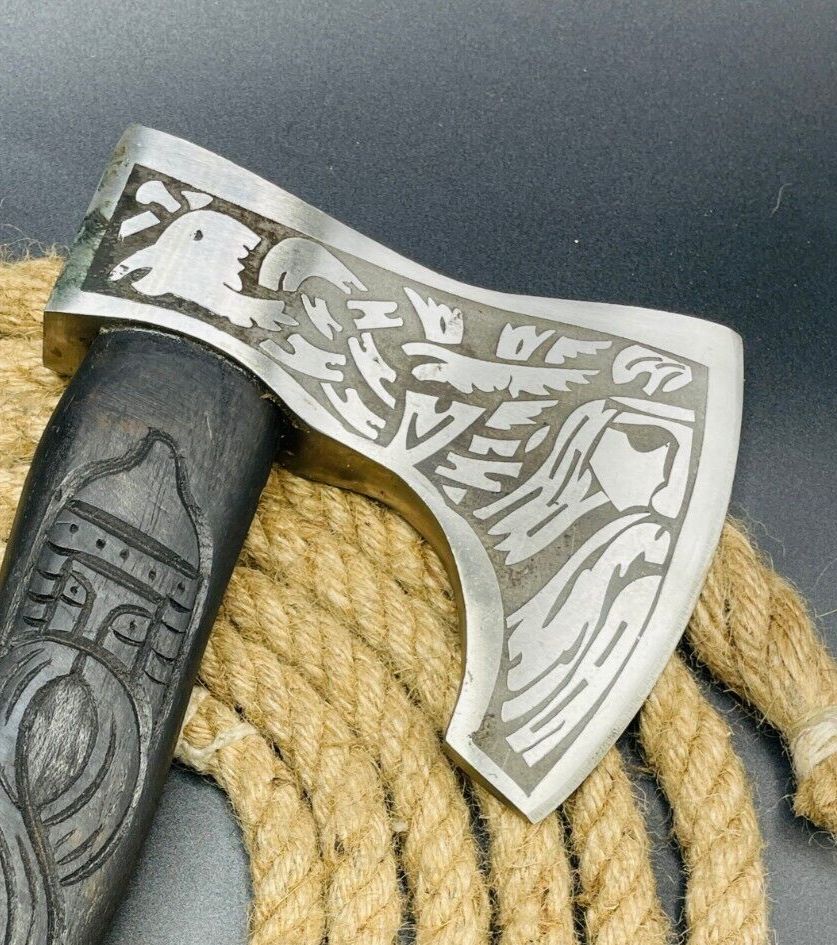 The design features a classic integral axe construction, ensuring durability and stability in every strike. Its natural wooden handle is shaped for a comfortable grip, providing excellent control and a timeless Viking aesthetic. The sleek blackened finish on the blade gives it a bold, tactical look while enhancing resistance against wear.
