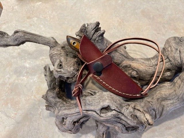 This knife is paired with a handmade leather sheath that includes a leather thong for convenient attachment. Although it does not have a belt loop, the sheath is designed for traditional carry and provides secure blade protection. Built with care, the knife’s blade composition combines 15n20 and 1095 high carbon steel, folded into 192+ layers, with a tested 56–60 HRC hardness, ensuring resilience and cutting efficiency.
