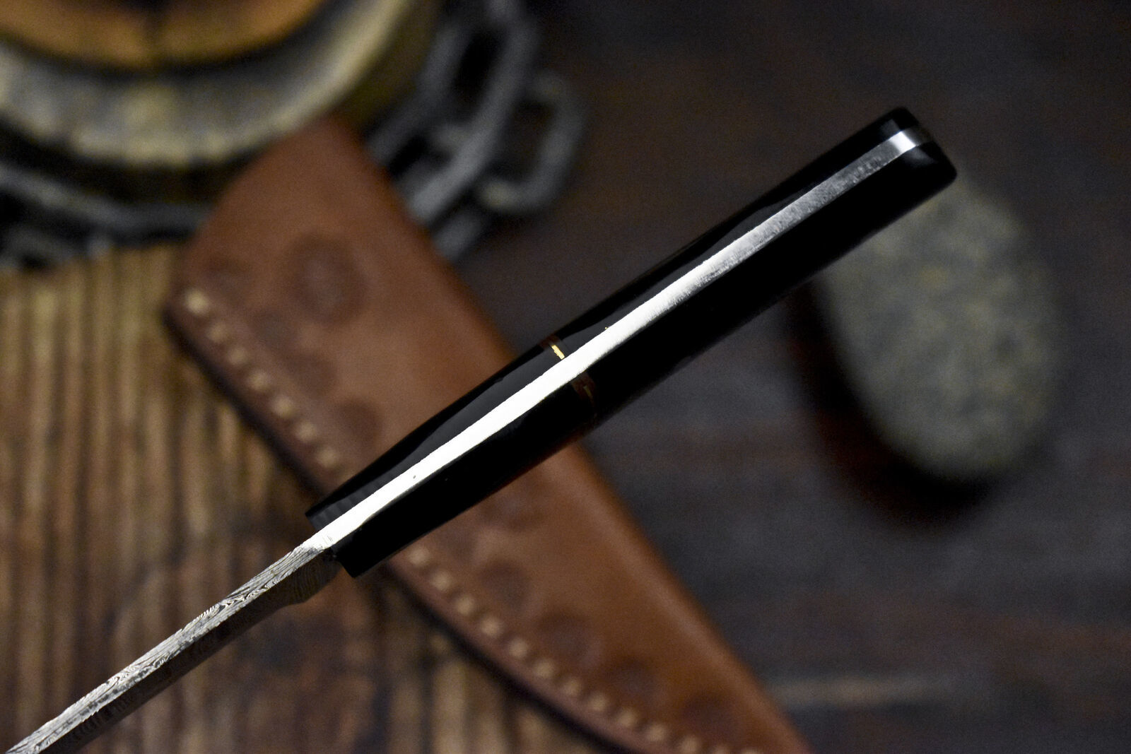 The handle is crafted from authentic bull horn, a naturally durable material known for its strength and distinctive organic texture. This gives the knife a firm grip and a traditional appeal that complements its custom build. The blade is oil-tempered to a Rockwell hardness of 58–60 HRC, ensuring excellent edge retention for fieldwork.