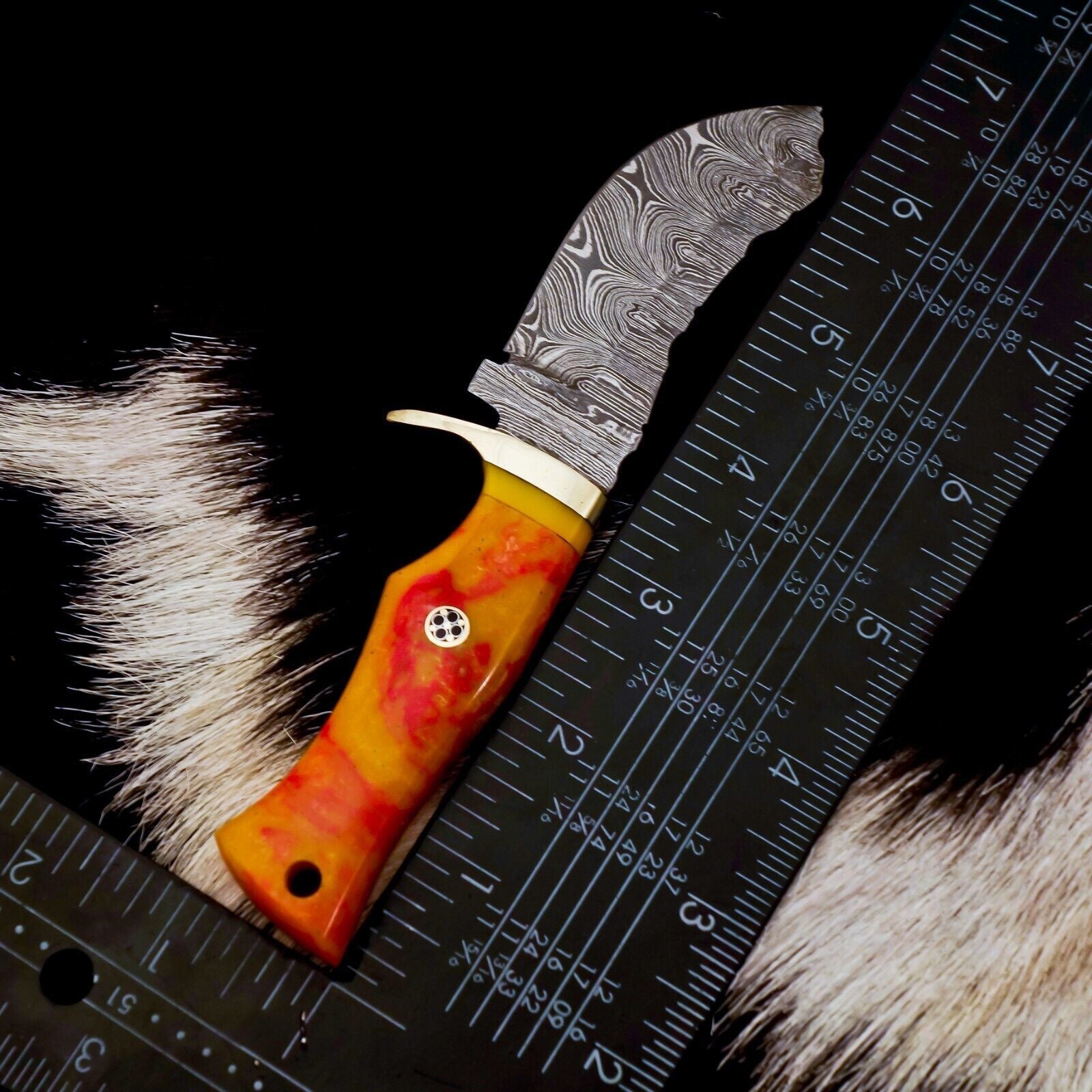 6.5 Inch Twist Damascus Hidden Tang Skinner Knife with Leather Sheath