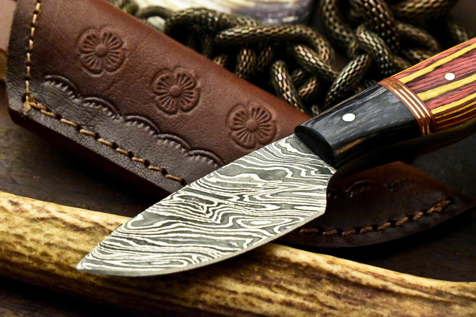 The Heritage Forge 7.5” Handmade Damascus Bowie Knife is a compact yet powerful blade, designed for precision and reliability. Forged from a blend of 1095 high carbon steel and 15N20 nickel steel, the 3.75-inch Damascus blade showcases over 384 layers of intricate wave patterns, achieved through hours of meticulous forging and acid etching. With a hardness of 58–60 HRC, the blade is razor sharp, durable, and ready for both outdoor use and collection display.