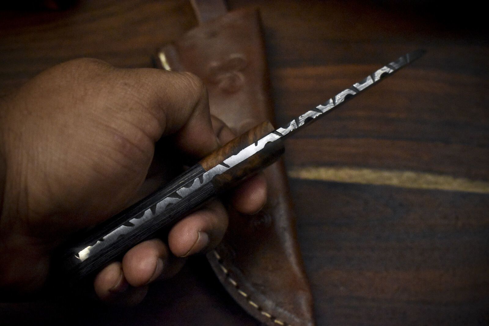 This 7.5-inch custom handmade Damascus skinner knife features a bold twist Damascus steel blade, crafted by hand from 1095 and 15N20 steel. The 3.5-inch blade is acid etched to reveal a striking swirl pattern, giving it a flowing, dynamic appearance while enhancing its edge retention and strength. With an oil-tempered hardness of 58–60 HRC, this compact damascus skinner hunting knife is built to perform reliably in rugged field environments.