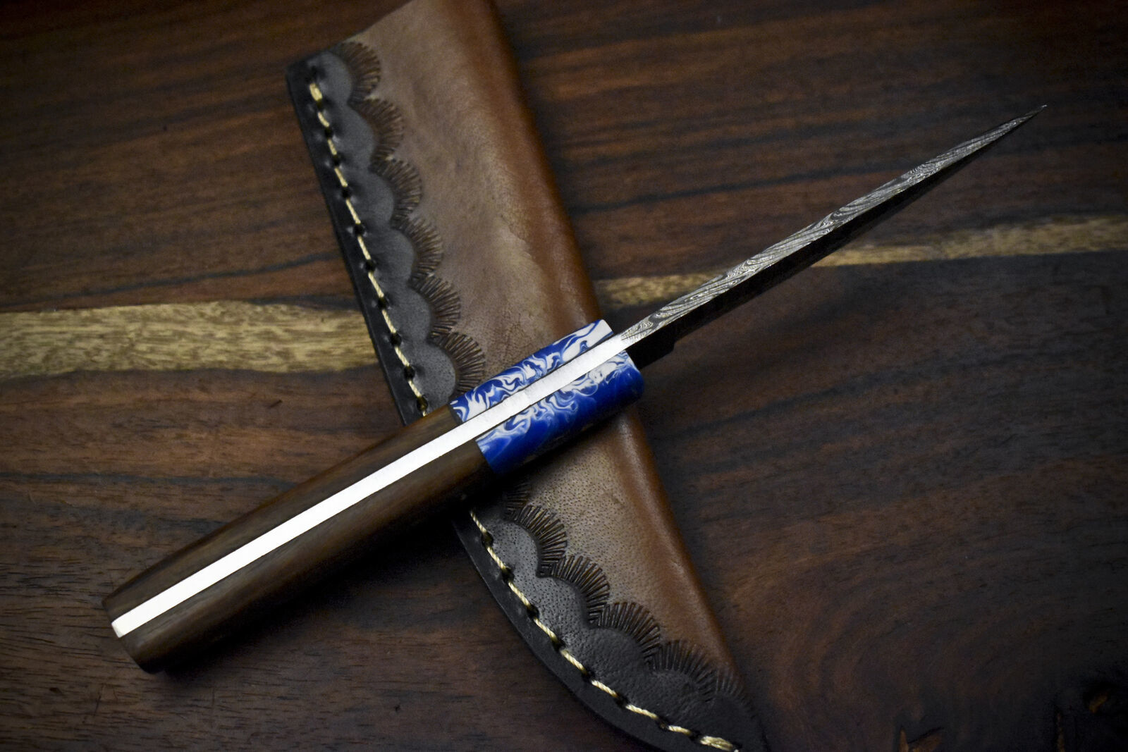 This handmade skinner damascus knife includes a thick, hand-stitched leather sheath for secure carry and storage. Every detail—from the layered blade to the ergonomic design—emphasizes custom quality and functionality. A true companion for the outdoors, this damascus knife custom handmade fixed blade hunting knife skinner also makes a valuable gift for survivalists and hunters. Each knife is one of a kind, made without CNC or pre-cut blanks, ensuring true craftsmanship in every piece.