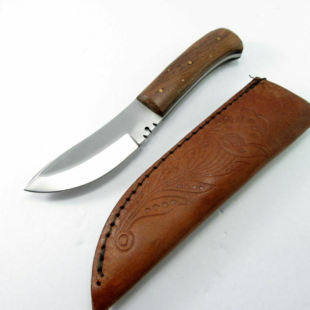 7.75" Upswept Blade Skinner Knife – Full Tang Stainless Steel with Wood Handle & Leather Sheath
