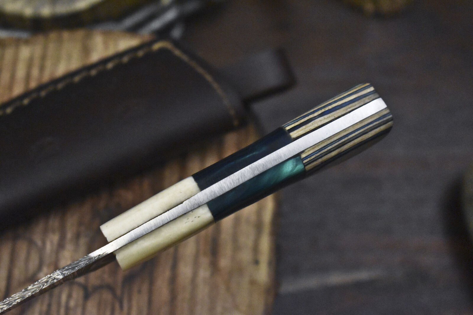 Forged from a blend of 1095 and 15N20 steel, the Damascus steel is layered repeatedly and acid-etched to bring out the twist pattern — a captivating, swirling design that reflects light with a bold contrast between dark and silver tones. This finish adds both artistic character and functional strength. The mixed material handle offers a secure grip in all weather conditions, making it a practical tool for skinning, field dressing, or bushcraft.