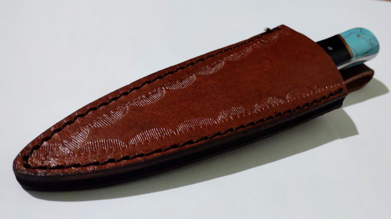 The Heritage Forge 7" Full Tang Skinner Dagger Hunting Bowie Knife is a precision-crafted tool for hunters, collectors, and outdoor enthusiasts who value both style and performance. The 440 stainless steel dagger blade is polished and razor-sharp, offering excellent edge retention and durability for skinning, field dressing, and tactical use. The handle features vintage blue turquoise pattern composition scales, secured with brass spacers and nickel silver pins, providing a comfortable and secure grip while adding a unique, eye-catching design. Full tang construction ensures maximum strength, balance, and long-lasting reliability. Each knife comes with a hand-stitched leather sheath, offering safe carry and convenient belt storage. With an overall length of 7", this skinner dagger Bowie knife combines compact portability with superior functionality. Heritage Forge blends traditional craftsmanship with high-quality materials, making this knife ideal for outdoor use, camping, bushcraft, or as a collectible gift.