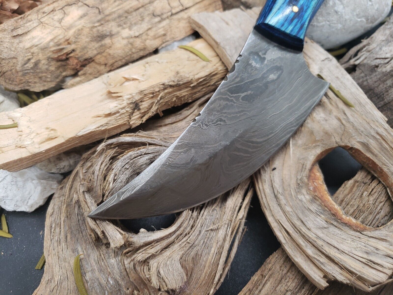 7" Handmade Damascus Hunting Bowie Knife | Blue Wood Handle & Leather Sheath
