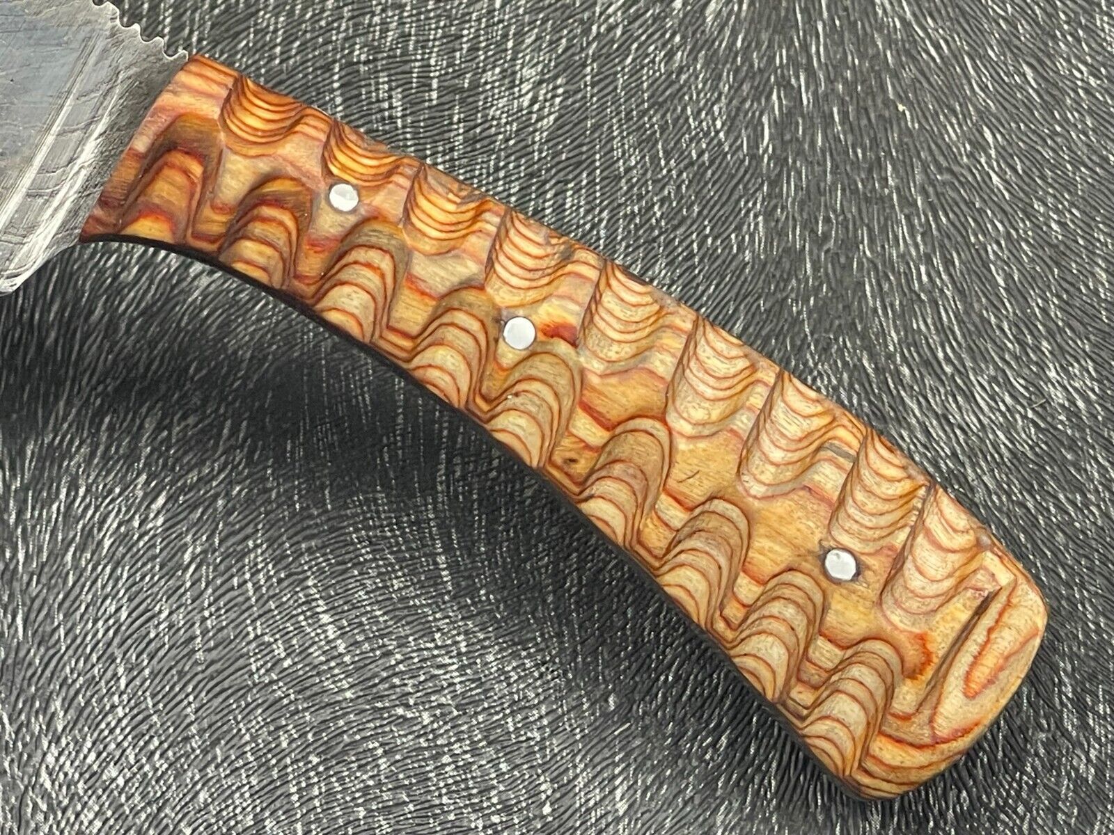 The 3 inch Damascus blade is hand forged and heat-treated to a hardness of 58-60 HRC, ensuring incredible edge retention and toughness. Its 4 inch ergonomic handle is carved from hand-selected hardwood and securely pinned for strength, while the full tang design with detailed file work along the spine provides superior grip and control.