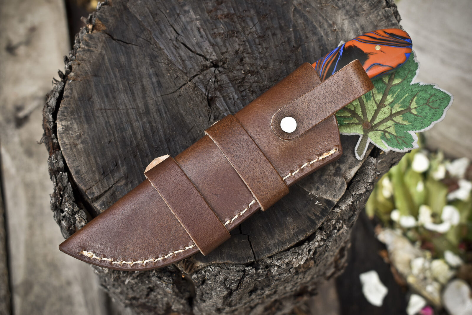 This knife includes a custom hand-stitched leather sheath for safe and easy carry. Every knife is 100% handmade, with no CNC or water-jet equipment used in production, ensuring each piece is unique.