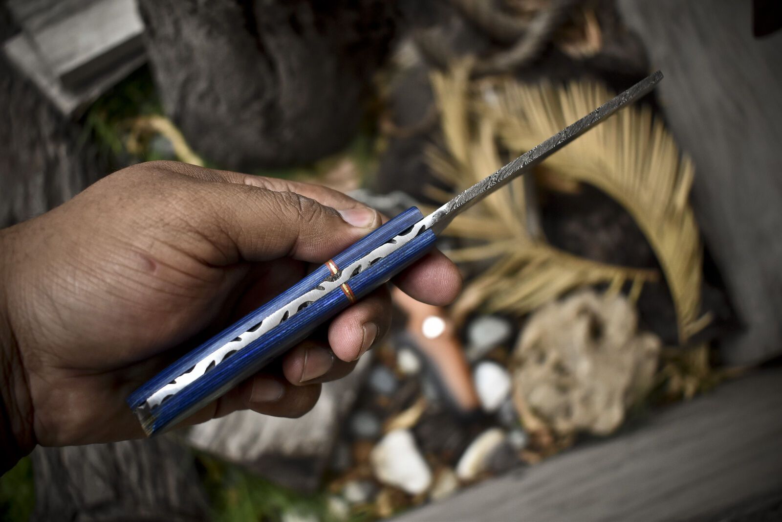This 8.0-inch custom hunting skinner knife features a stunning twist pattern Damascus steel blade paired with a premium hardwood handle, making it an ideal tool for hunters, hikers, and outdoor enthusiasts. The 4.0-inch blade is crafted from high-quality Damascus steel, forged from 1095 and 15N20 layers, folded multiple times to create exceptional strength, edge retention, and a captivating swirl pattern. This unique twist design offers a dynamic, flowing aesthetic with contrasting shades of deep black and bright silver. The 4.0-inch hardwood handle is polished for comfort and grip, enhanced by a sturdy wooden bolster for added balance and control. Perfect for skinning, trapping, wood carving, and outdoor tasks, this knife is built for performance and durability. It comes complete with a handcrafted thick leather sheath, designed for long-term protection and easy carrying. Each sheath is hand-tooled and stitched for extra resilience. This handmade piece is unique, with no CNC or precut blanks used, ensuring every knife has its own distinct character. With proper care, this knife will serve for years as a reliable companion in the field or collection.