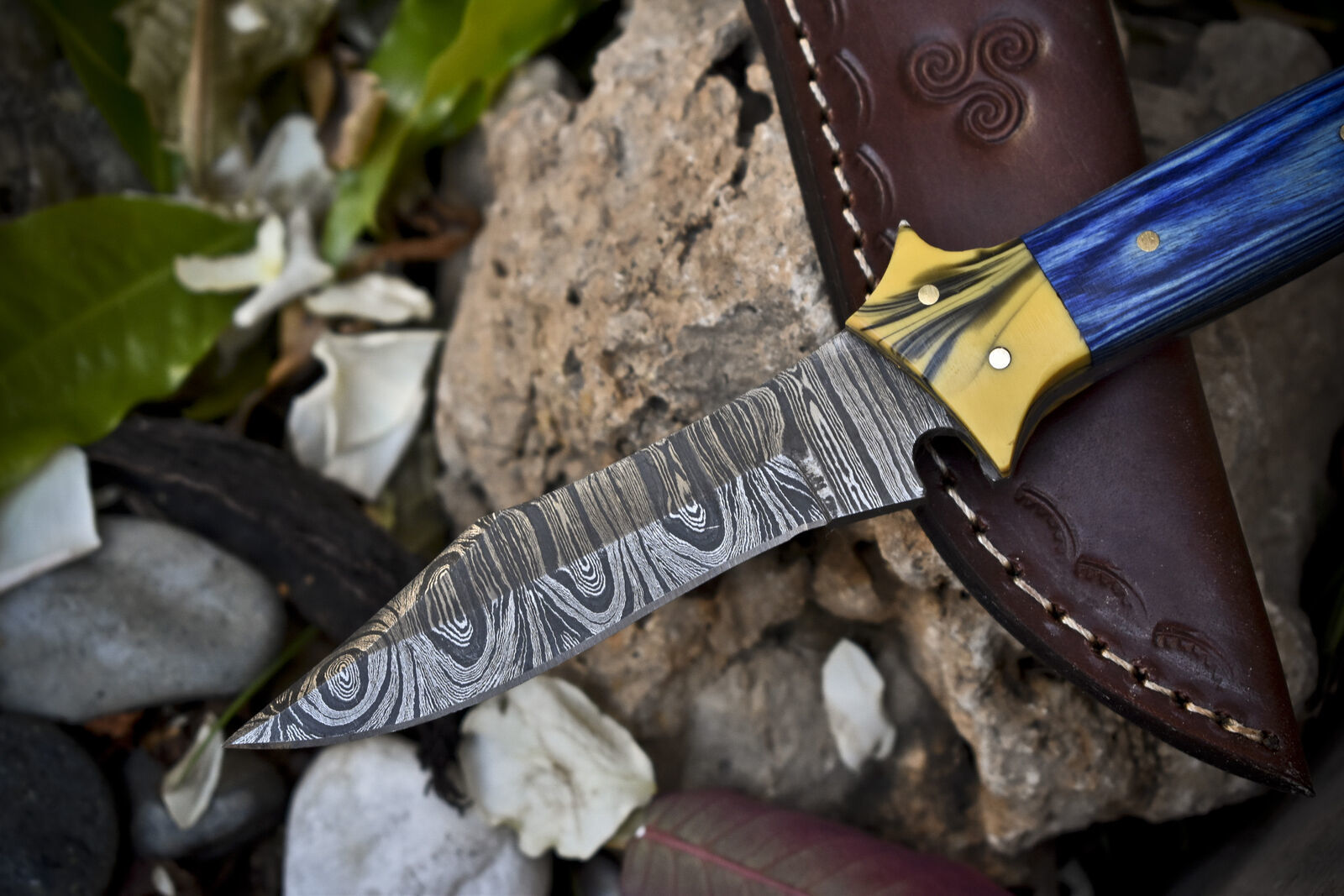 Experience precision and craftsmanship with this 8.0-inch hand crafted skinner knife, forged from twist Damascus steel for exceptional strength and stunning aesthetics. The blade, measuring 4 inches, is hand-forged from a mix of 1095 and 15N20 carbon steels, folded multiple times to create over 200 layers. This results in a durable, razor-sharp edge with a Rockwell hardness of 58–60 HRC, making it perfect for everyday carry, skinning, hunting, or camping.