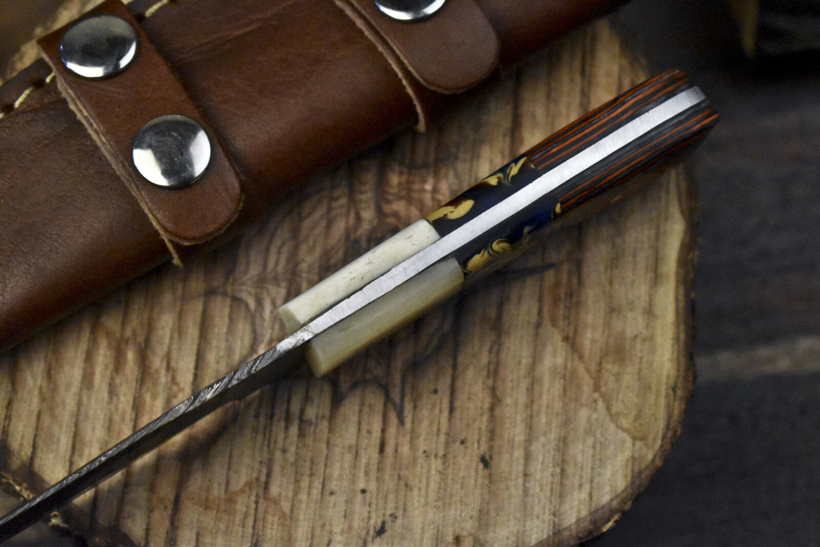 The 3.5-inch handle is made from mixed materials, carefully chosen for a secure grip and visual appeal. Each handle is unique in texture and tone, offering both function and personality. This knife is full tang and balanced for precision cutting and heavy-duty fieldwork.