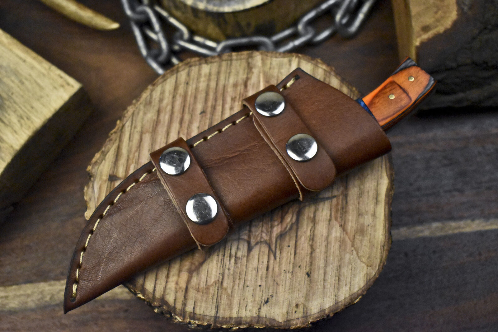 The included custom leather sheath is hand-stitched and designed to protect your knife in rugged conditions. Whether you're a hunter, camper, or collector, this knife stands out for its practical strength and handcrafted beauty.