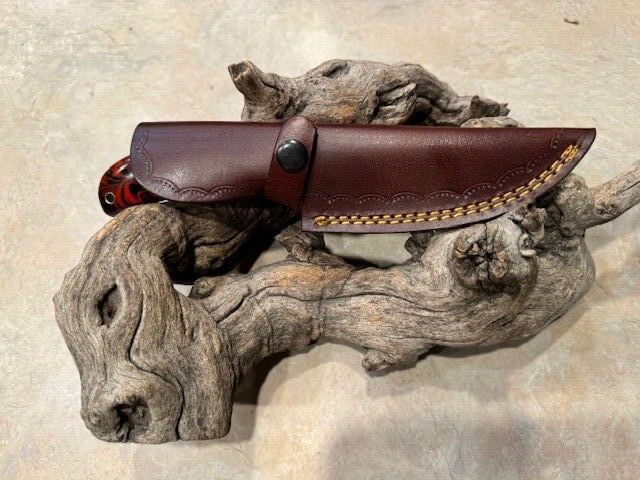 The handle is made from high-quality ceramic, measuring approximately 4.15 inches, secured with two stainless pins for stability and a comfortable grip. Its smooth yet firm texture enhances control during precise cuts. Each knife is paired with a handmade leather belt sheath, offering secure storage and easy portability for hunters and outdoor adventurers.