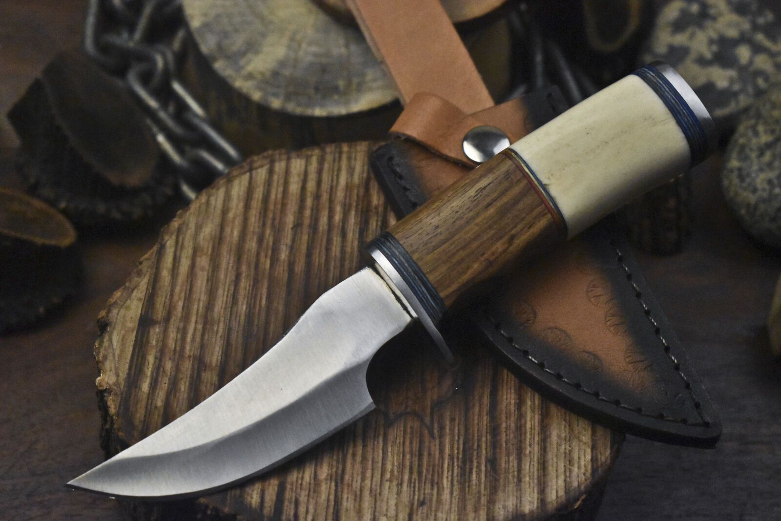8" 440C Steel Skinner Knife with Bone and Wood Handle & Steel Guard Leather Sheath