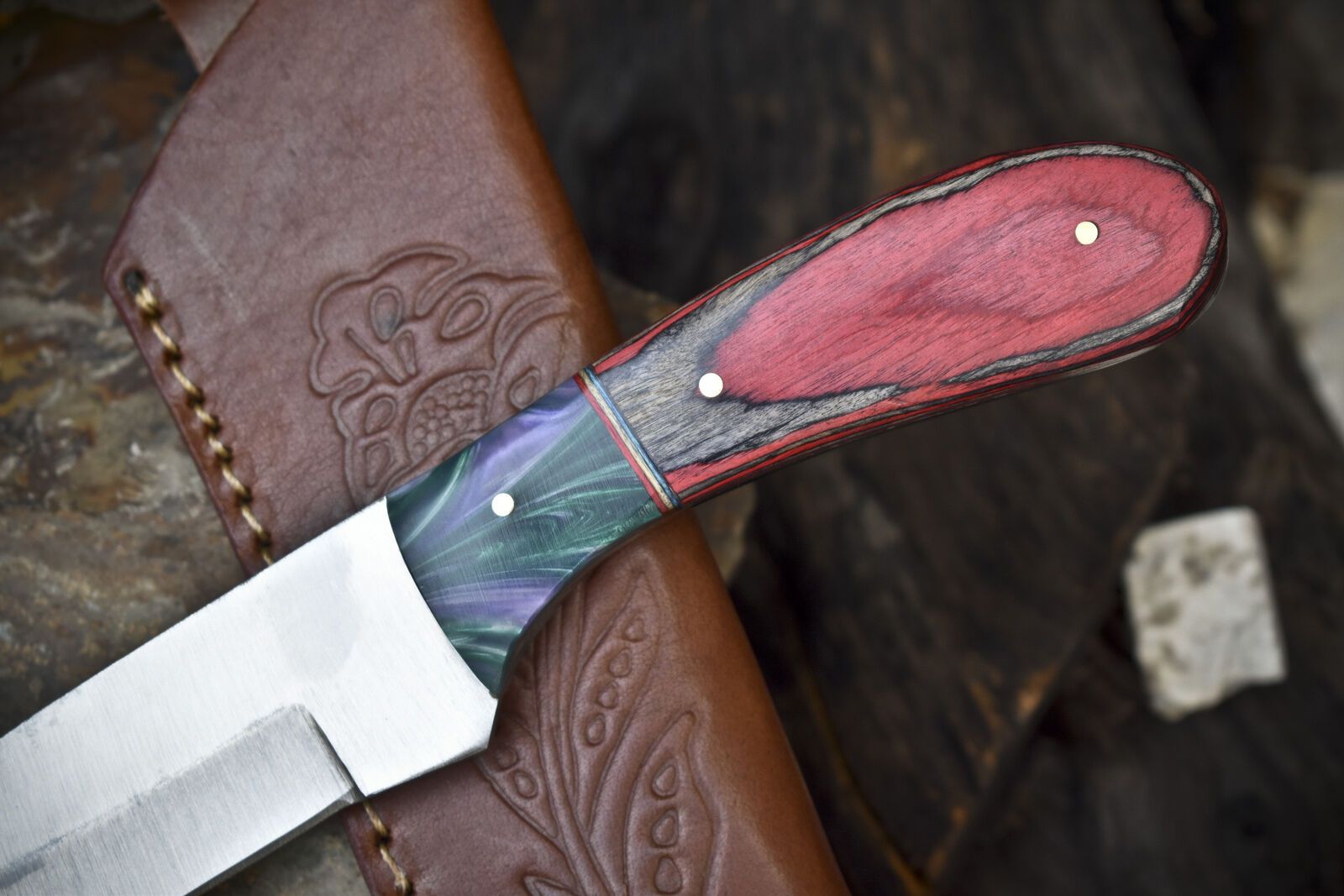 8.5" Custom Forged Skinner Knife | AUS-8 Steel Blade | Hard Wood Handle with Leather Sheath