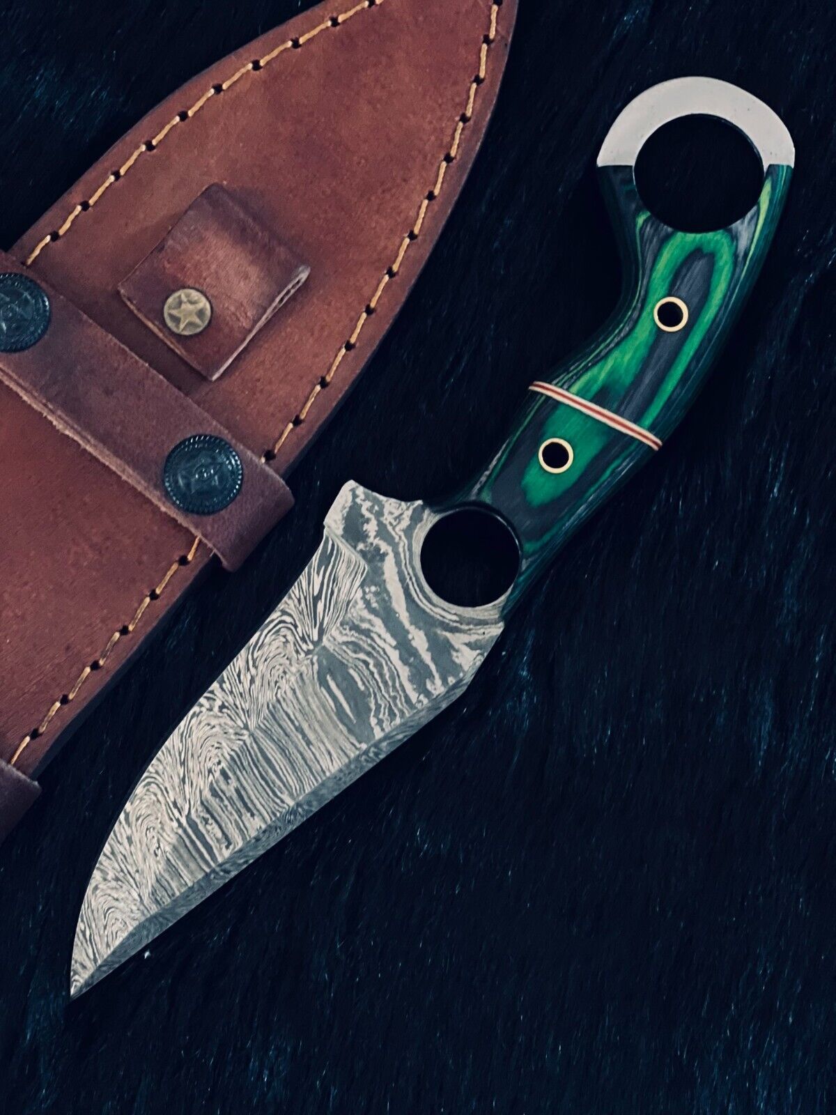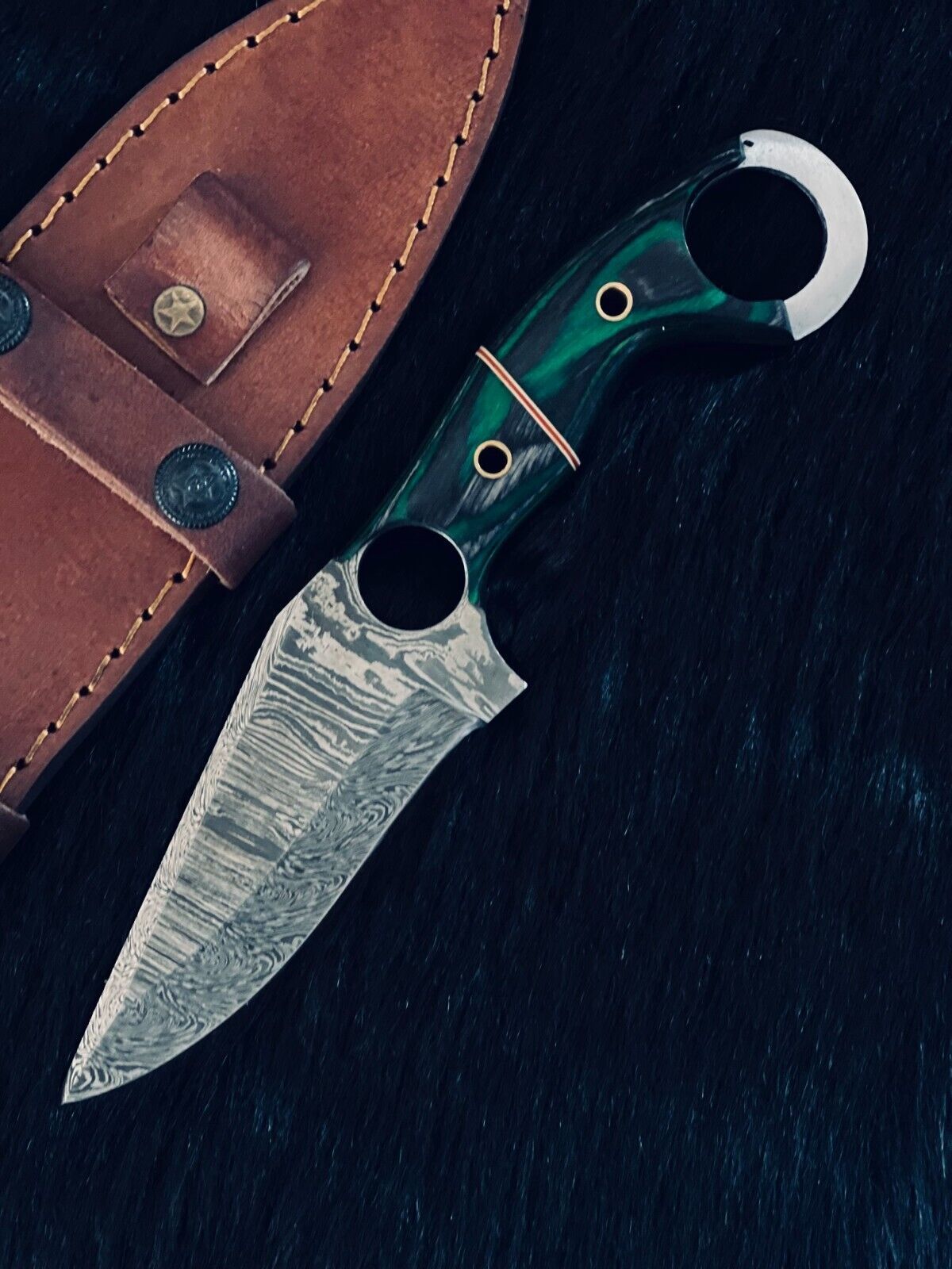 The handle combines stained camel bone with natural wood, accented by brass spacers and a handmade Damascus steel bolster, providing a comfortable and secure grip with elegant detailing. This fully functional, full tang knife arrives with a custom sheath, ready to accompany you on hunting trips or camping adventures.