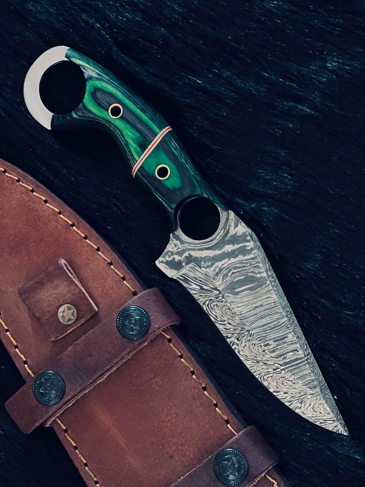 The blade is forged from 512 layers of 1095 and 15N20 high-carbon Damascus steel, expertly crafted to produce a mesmerizing fire-like pattern that enhances both beauty and cutting performance. Its 4 mm thickness and heat treatment result in a Rockwell hardness of 54 HRC, ensuring durability and a razor-sharp edge that withstands rigorous outdoor use.
