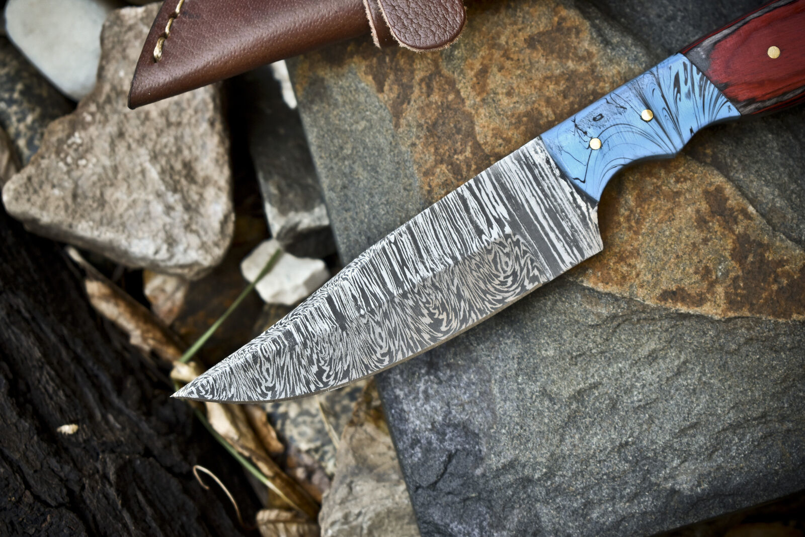 Crafted for collectors and outdoor professionals, this forged damascus skinner knife features a stunning twist pattern Damascus blade, forged by layering and folding 1095 and 15N20 steel multiple times. Burned in acid for a bold finish, the swirling lines of the twist design create a captivating look and superior hardness. With an overall length of 8.5 inches and a blade length of 4.5 inches, this knife offers precision cutting for hunting, skinning, and general outdoor tasks.